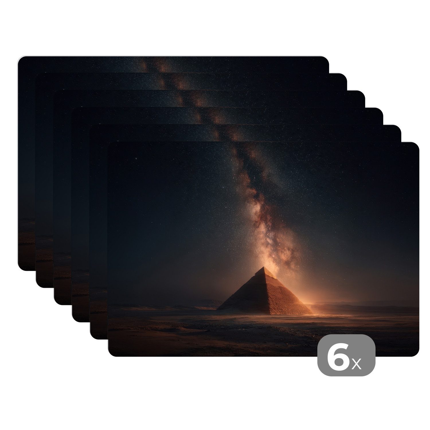 Eine beleuchtete Pyramide erhebt sich in der Wüste, während die Milchstraße als leuchtende Säule direkt über ihr aufzutauchen scheint.