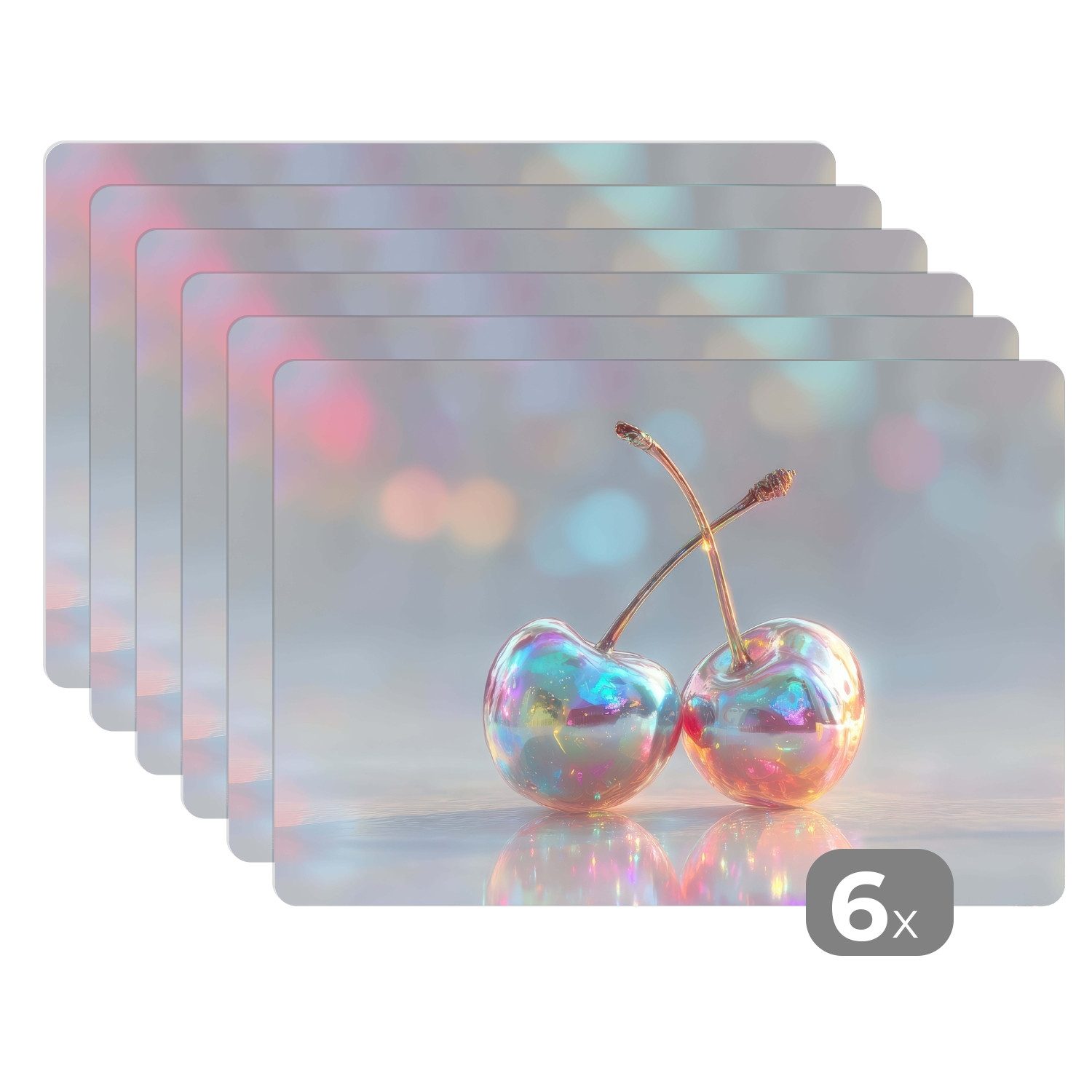 Zwei Kirschen mit glänzender, reflektierender Haut in Regenbogenfarben liegen auf einer spiegelnden Fläche, leicht gekreuzt an den Stielen.