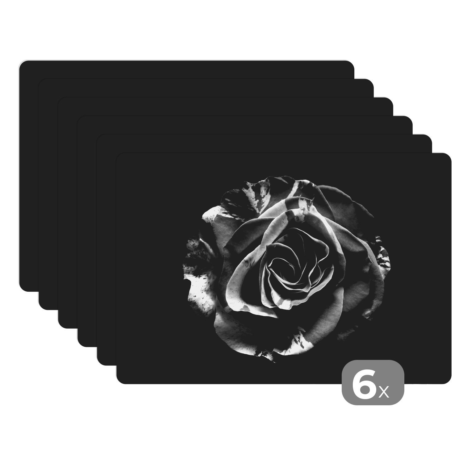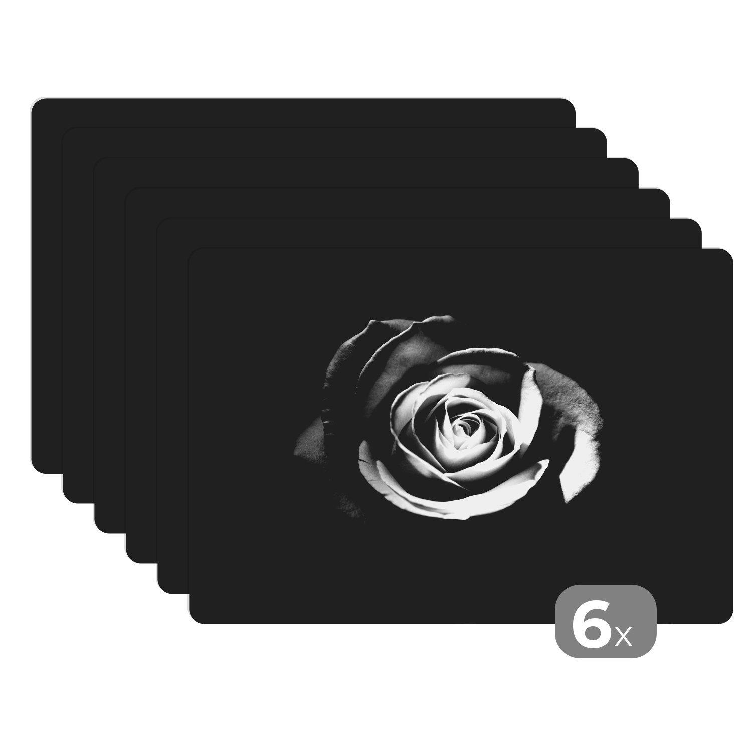 Schwarze und weiße Rose vor schwarzem Hintergrund.