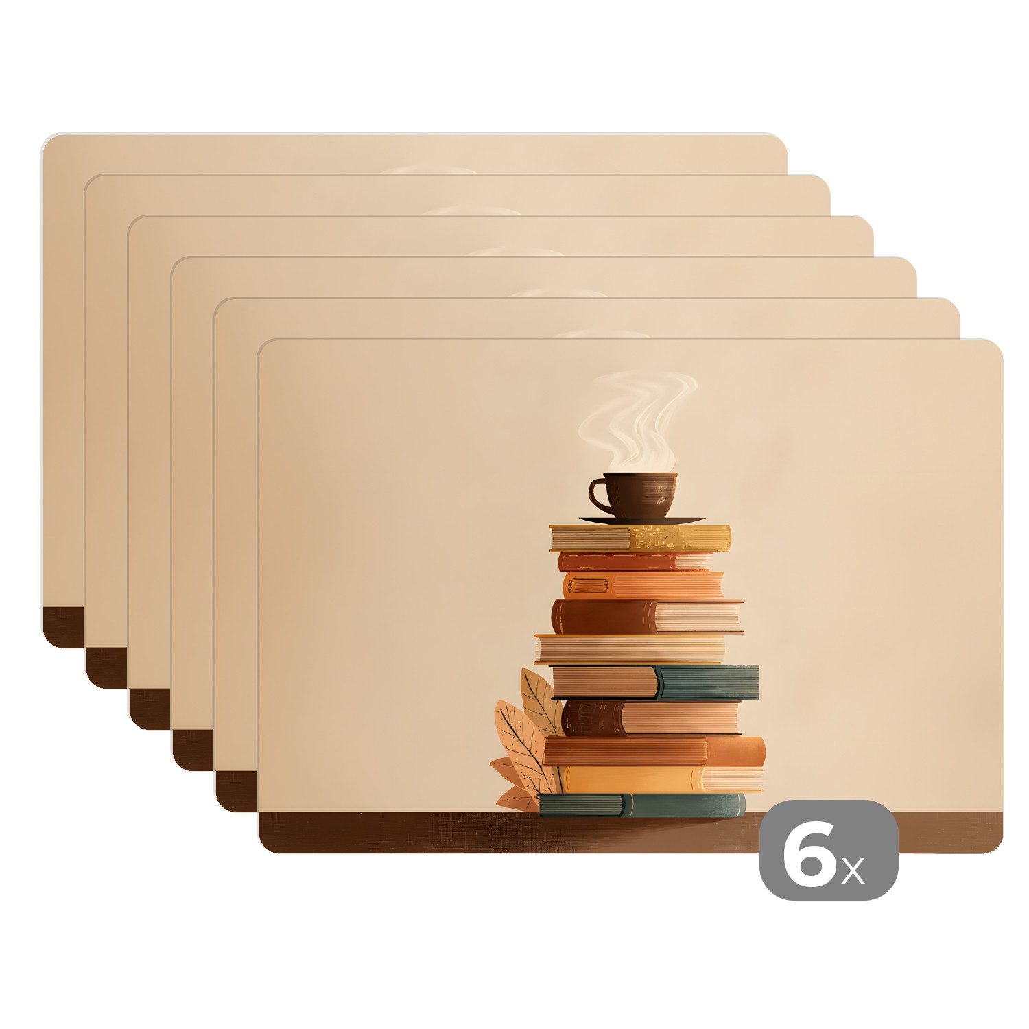 Ein Bücherturm in warmen Farbtönen trägt eine dampfende Kaffeetasse auf der Spitze und symbolisiert Lesevergnügen und Entspannung.