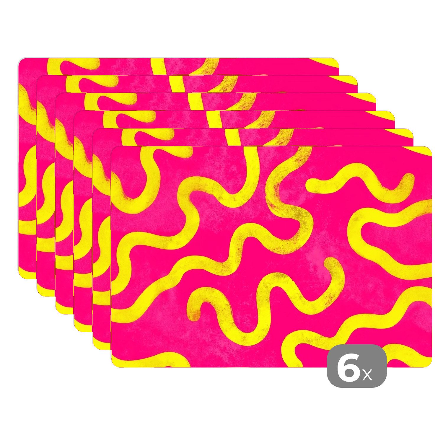 Sich windende, gelbe Linien bewegen sich über einen leuchtend rosa Hintergrund. Das Muster hat durch die Wiederholung und die leuchtenden Farben einen verspielten, fast psychedelischen Charakter.