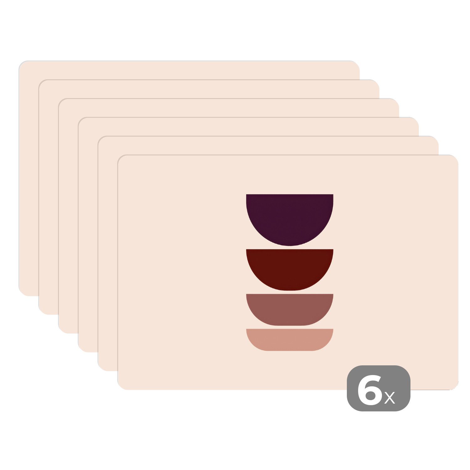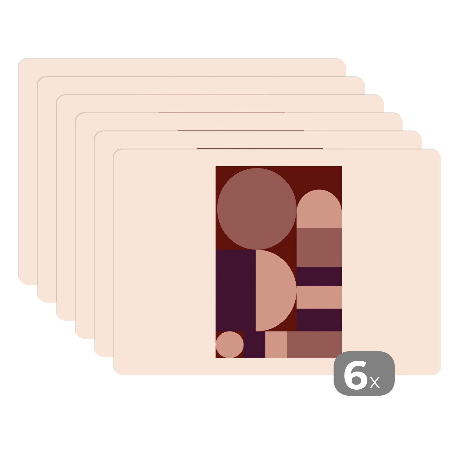 Eine Komposition aus Kreisen, Halbkreisen, Rechtecken und Streifen in tiefen Rot-, Aubergine- und Nude-Tönen. Die Formen sind eng in einem rechteckigen Rahmen auf einem blassrosa Hintergrund angeordnet. Das Ganze wirkt geometrisch, warm und grafisch ausgewogen.