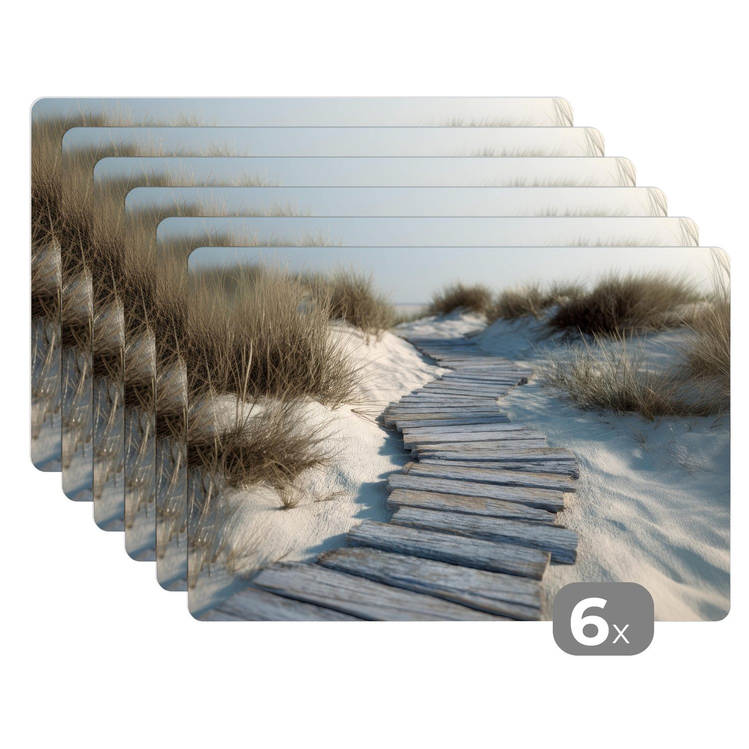 Ein gewundener Pfad aus verwitterten Brettern führt durch weiße Dünen mit Strandhafer. Der Horizont ist in dem weichen Licht schwach zu erkennen.