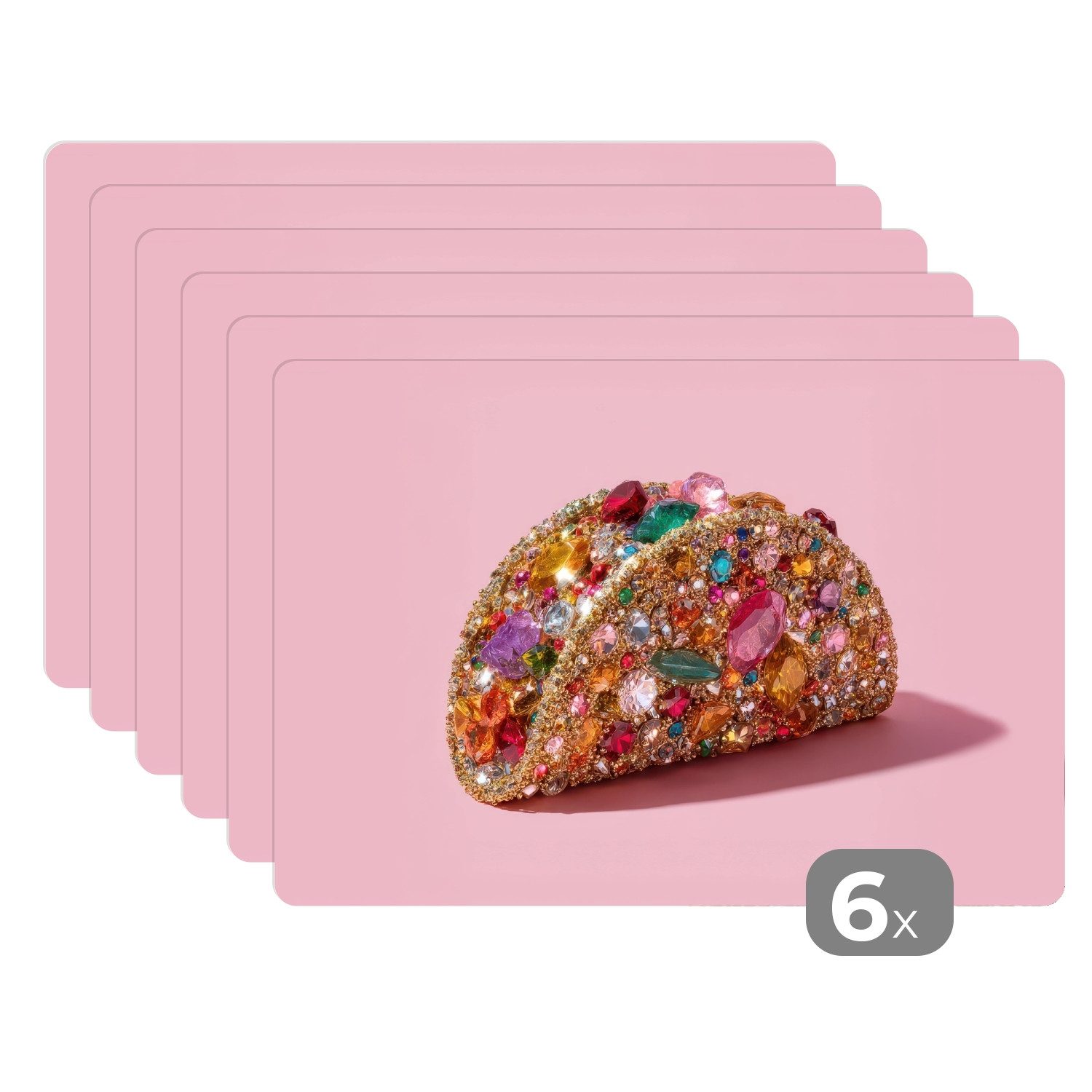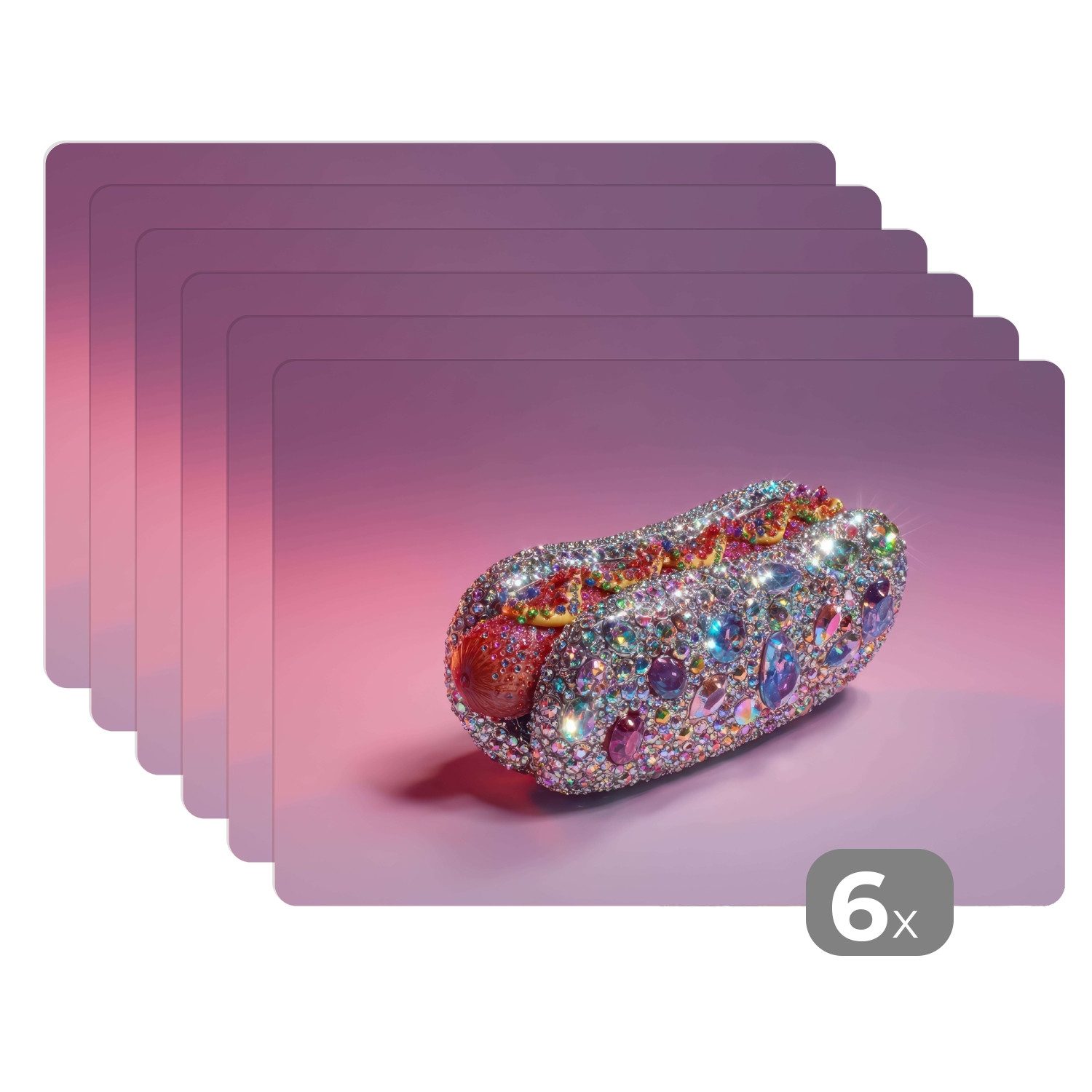Ein Hotdog ist vollständig mit glitzernden Steinen und Juwelen verziert. Der rosa-violette Hintergrund unterstreicht das extravagante Gefühl.