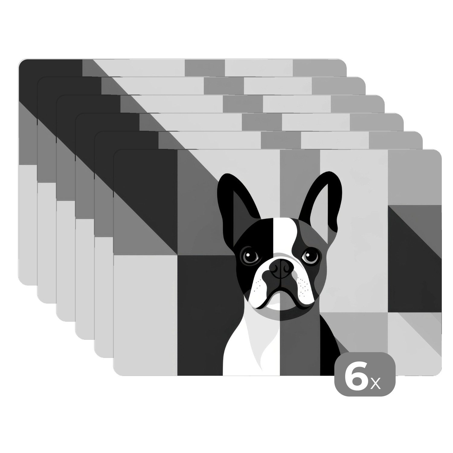 Eine französische Bulldogge ist frontal in Schwarz und Weiß vor einem Hintergrund aus geometrischen Grautönen und abstrakten Flächen abgebildet.