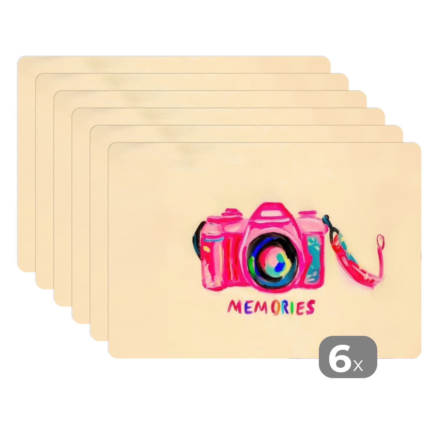 Eine leuchtend rosa Kamera mit Regenbogenobjektiv ist in verspielten Farben gemalt. Unter der Kamera steht in bunten Buchstaben das Wort "MEMORIES".