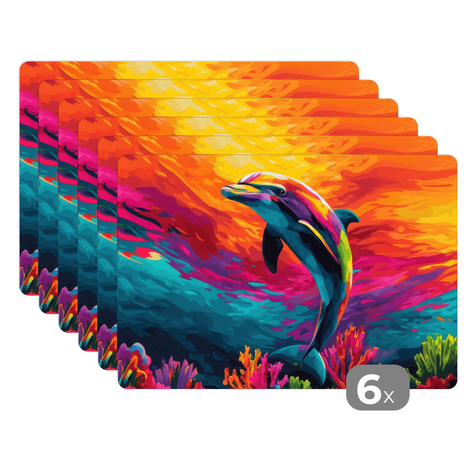 Ein glücklicher Delfin springt aus dem Wasser, umgeben von einem farbenfrohen Ozean mit lebhaften Korallenriffen. Der Himmel ist eine Explosion von Orange und Rot, während das Wasser Schattierungen von Blau und Rosa enthält. Der Delfin selbst ist blau mit gelben, rosa und violetten Akzenten.