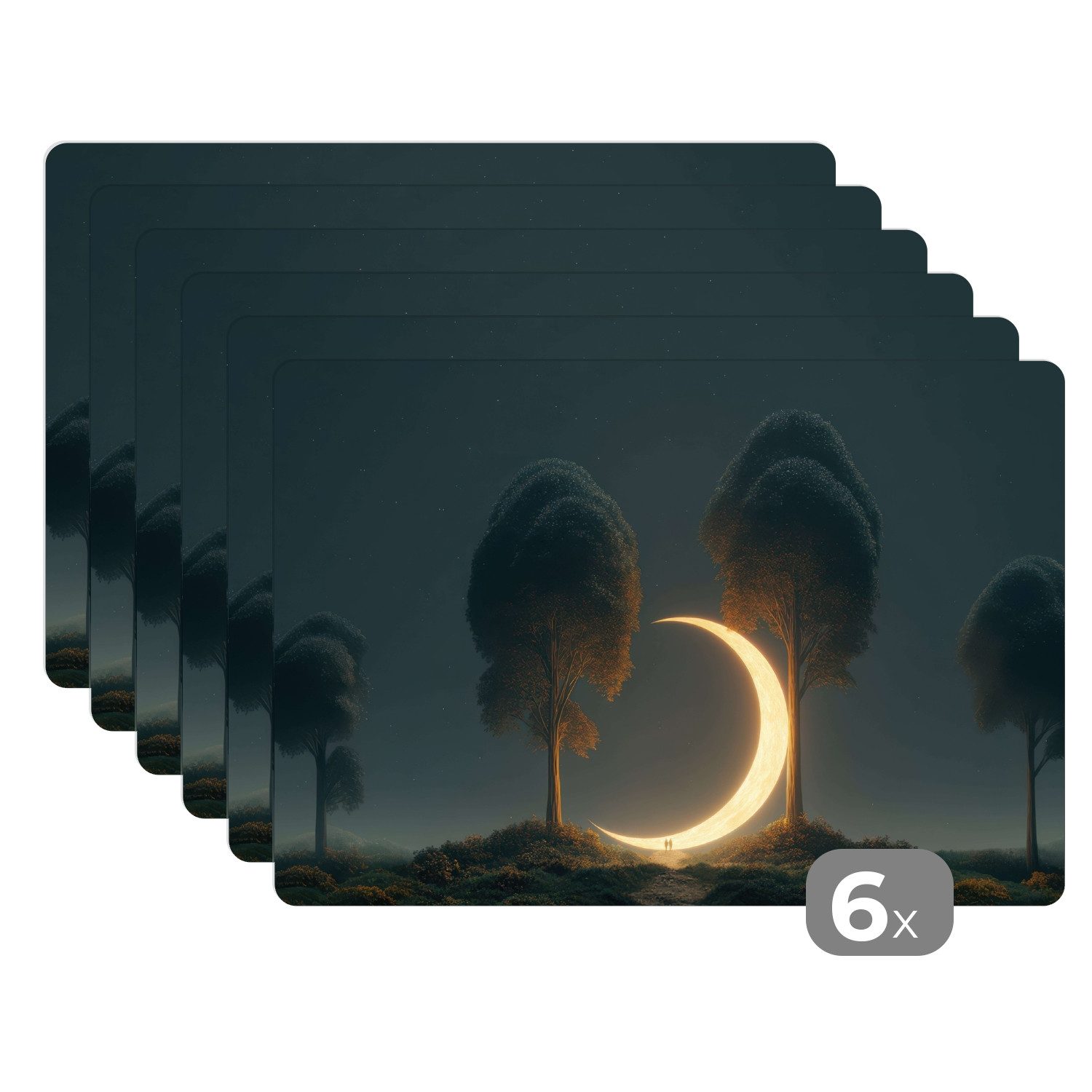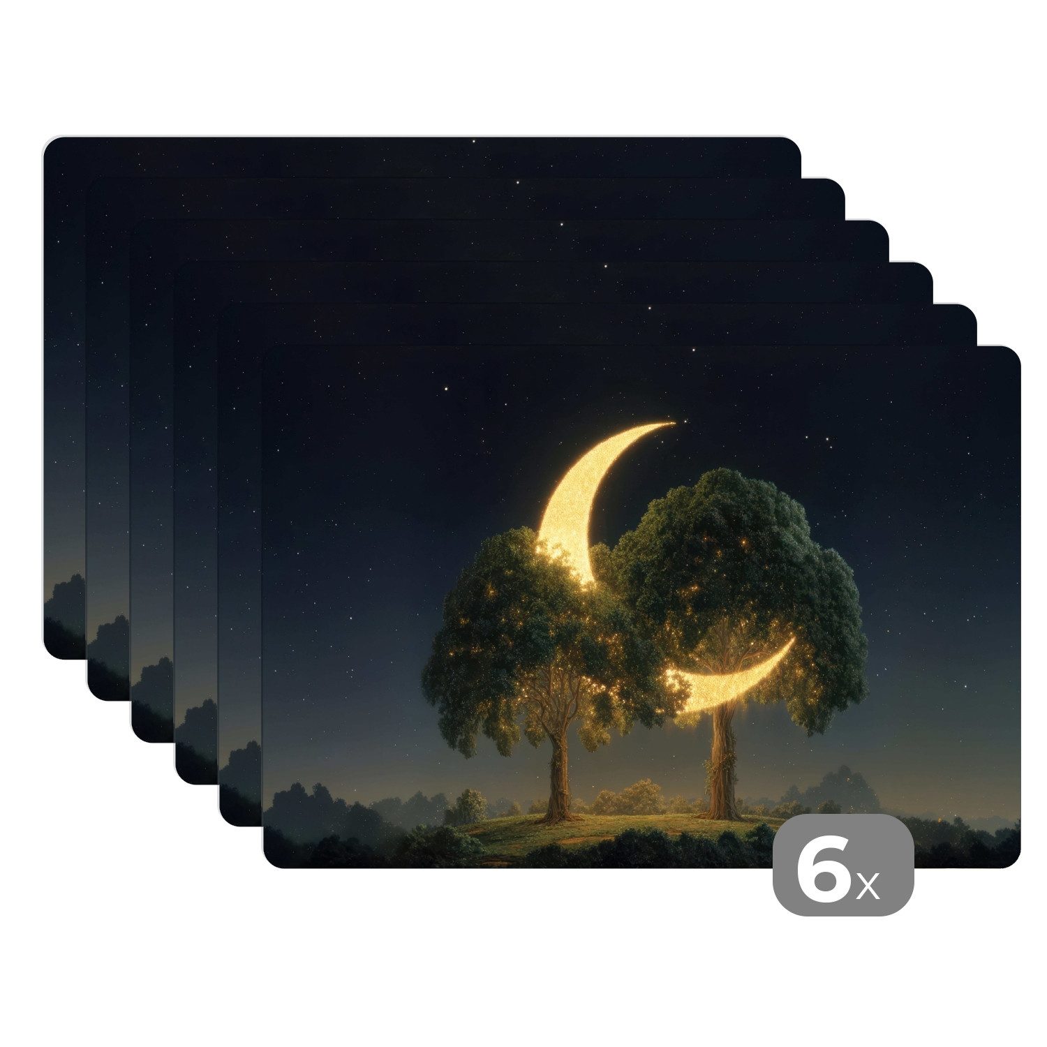 Zwei große Bäume stehen auf einer Hügelkuppe unter einem Sternenhimmel. Zwischen ihren Wipfeln hängt eine glitzernde, goldene Mondsichel, die sich wie ein leuchtendes Kunstwerk in die Baumkronen schmiegt. Die Szene strahlt Ruhe und Magie aus.