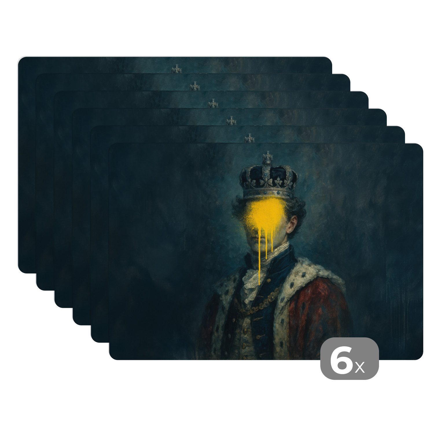 Ein königliches Porträt mit Krone und Hermelinmantel, dessen Gesicht mit tropfender gelber Farbe bedeckt ist.