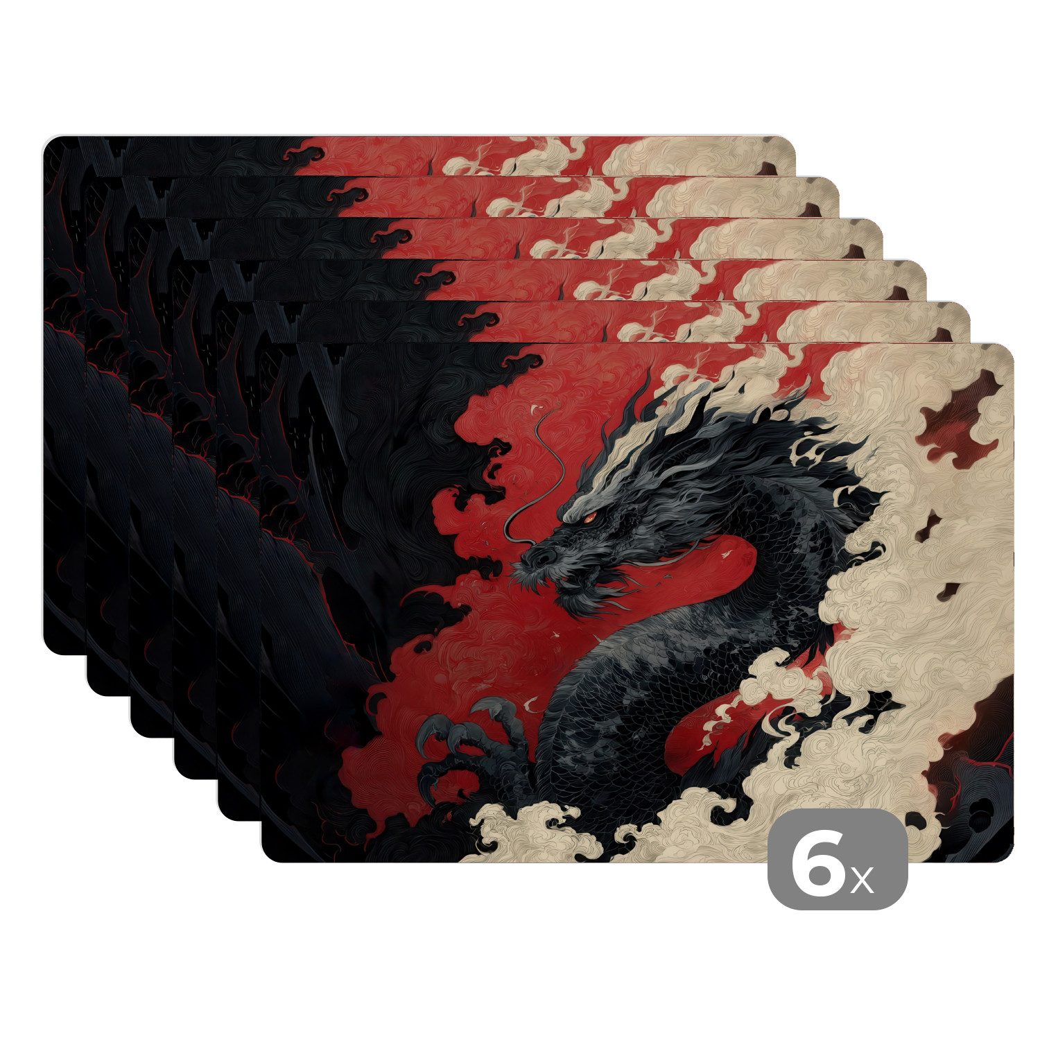 Zwischen sich drehenden Rauchwolken erhebt sich ein schwarzer Drache in Rot-, Schwarz- und Beigetönen, mächtig und bedrohlich.
