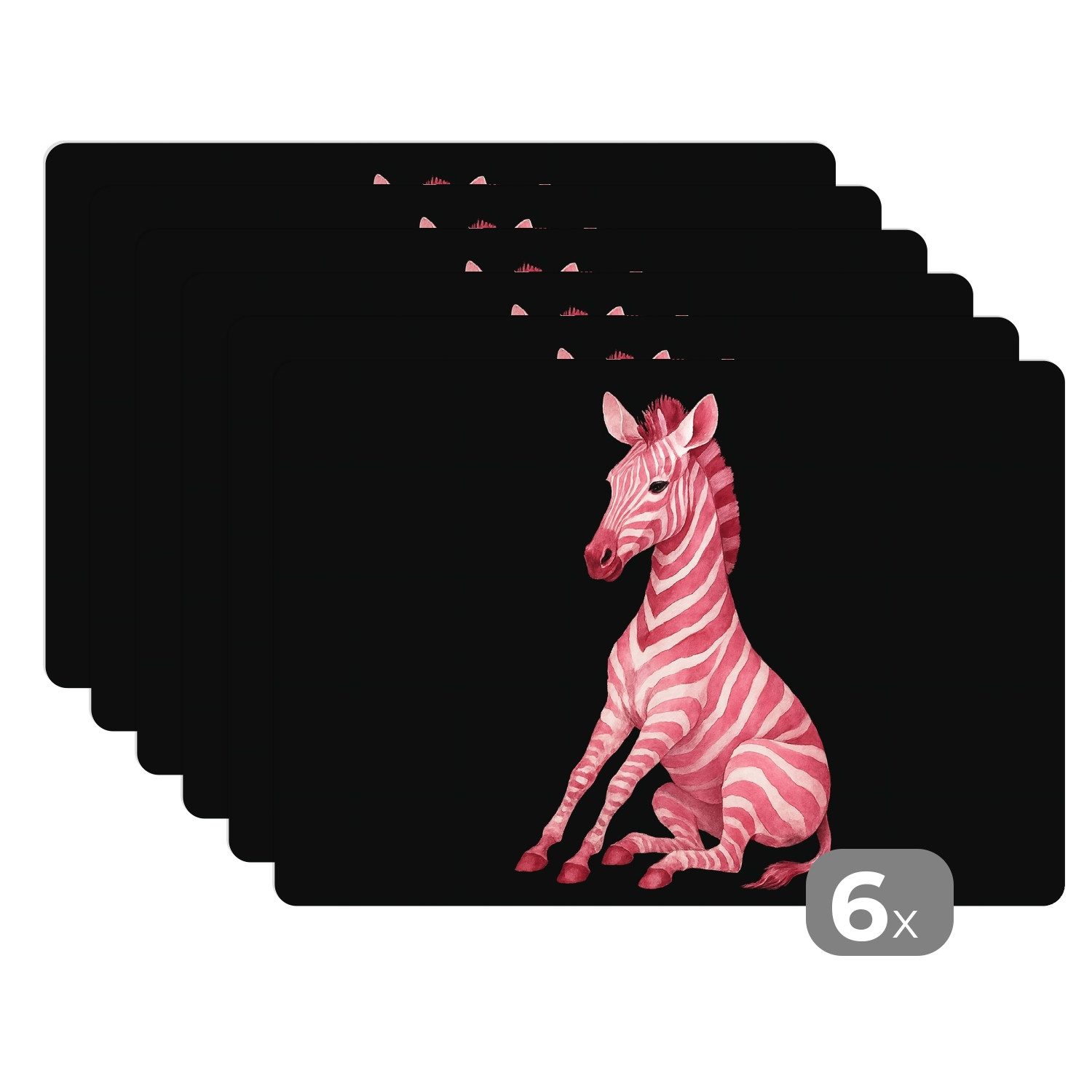 Ein sitzendes Zebra mit leuchtend rosa und hellrosa Streifen auf tiefschwarzem Hintergrund. Das Tier wirkt ruhig und durch die ungewöhnliche Farbgebung auffallend surreal.