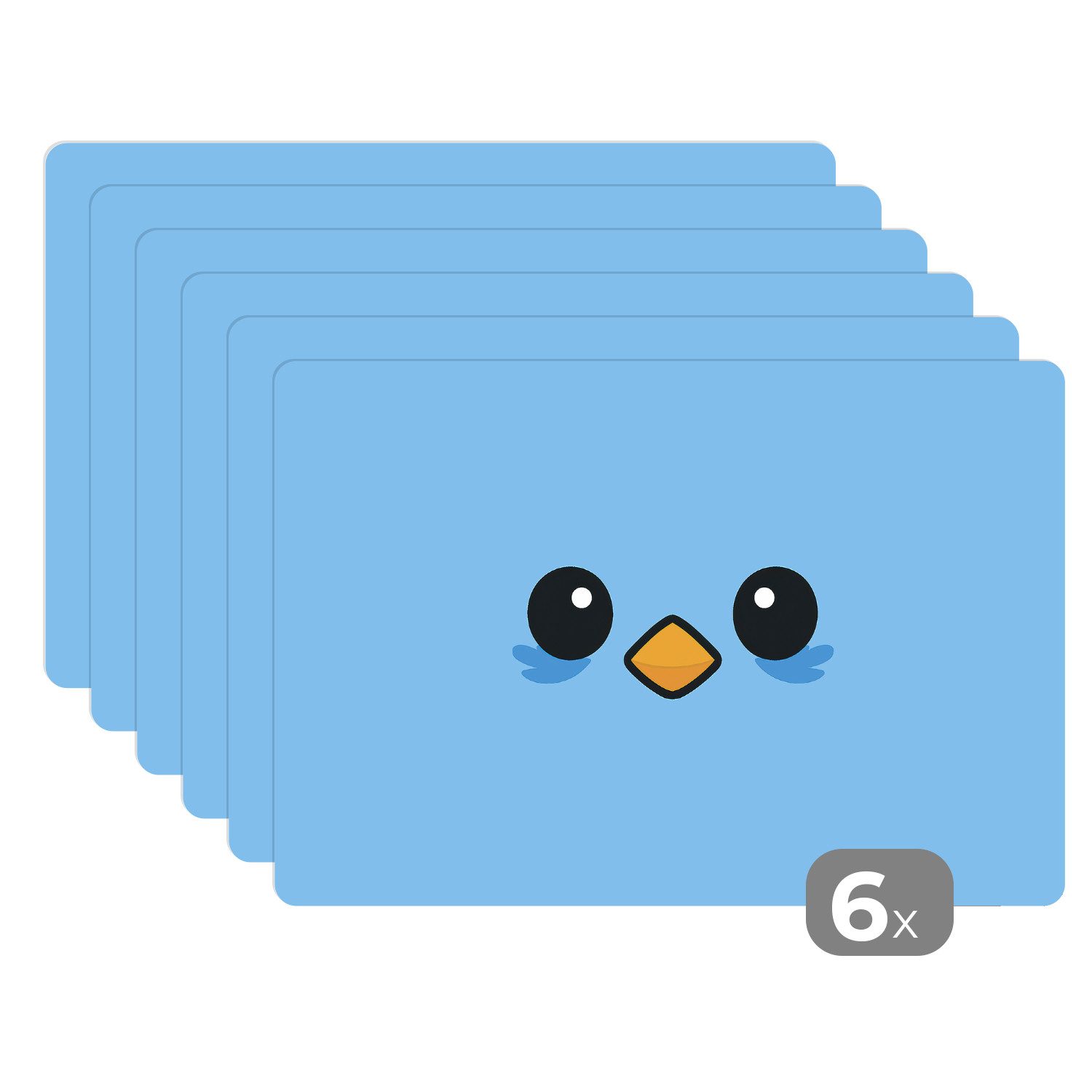 Ein stilisierter blauer Vogel mit großen schwarzen Augen, einem orangefarbenen Schnabel und kleinen blauen Flecken auf den Wangen schaut dich direkt an. Der Hintergrund ist hellblau und unterstreicht den süßen, schlichten Look.