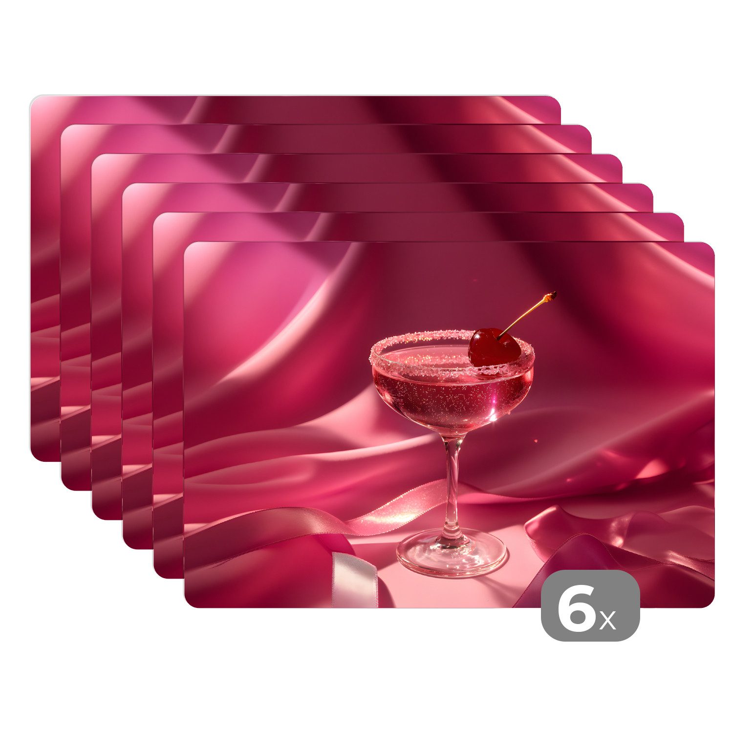 Ein Coupe-Glas, gefüllt mit einem rosafarbenen prickelnden Getränk, verziert mit einer Zuckerschicht am Rand und einer Kirsche am Rand. Der Hintergrund besteht aus glänzenden rosa Stoffen, die Luxus ausstrahlen.