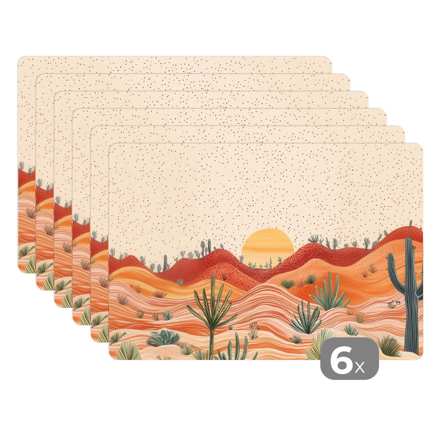 Illustration von sanften roten und orangefarbenen Hügeln mit Kakteen und Agaven, unter einer untergehenden Sonne vor einem beigen Himmel.