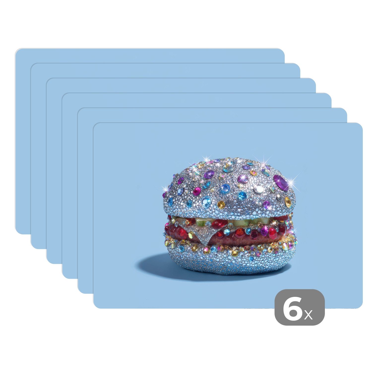 Ein Burger ist komplett mit funkelnden Juwelen und Glitter bedeckt. Der blaue Hintergrund sorgt für einen frischen, auffälligen Look.