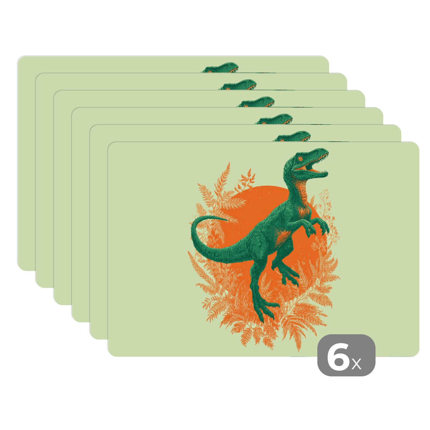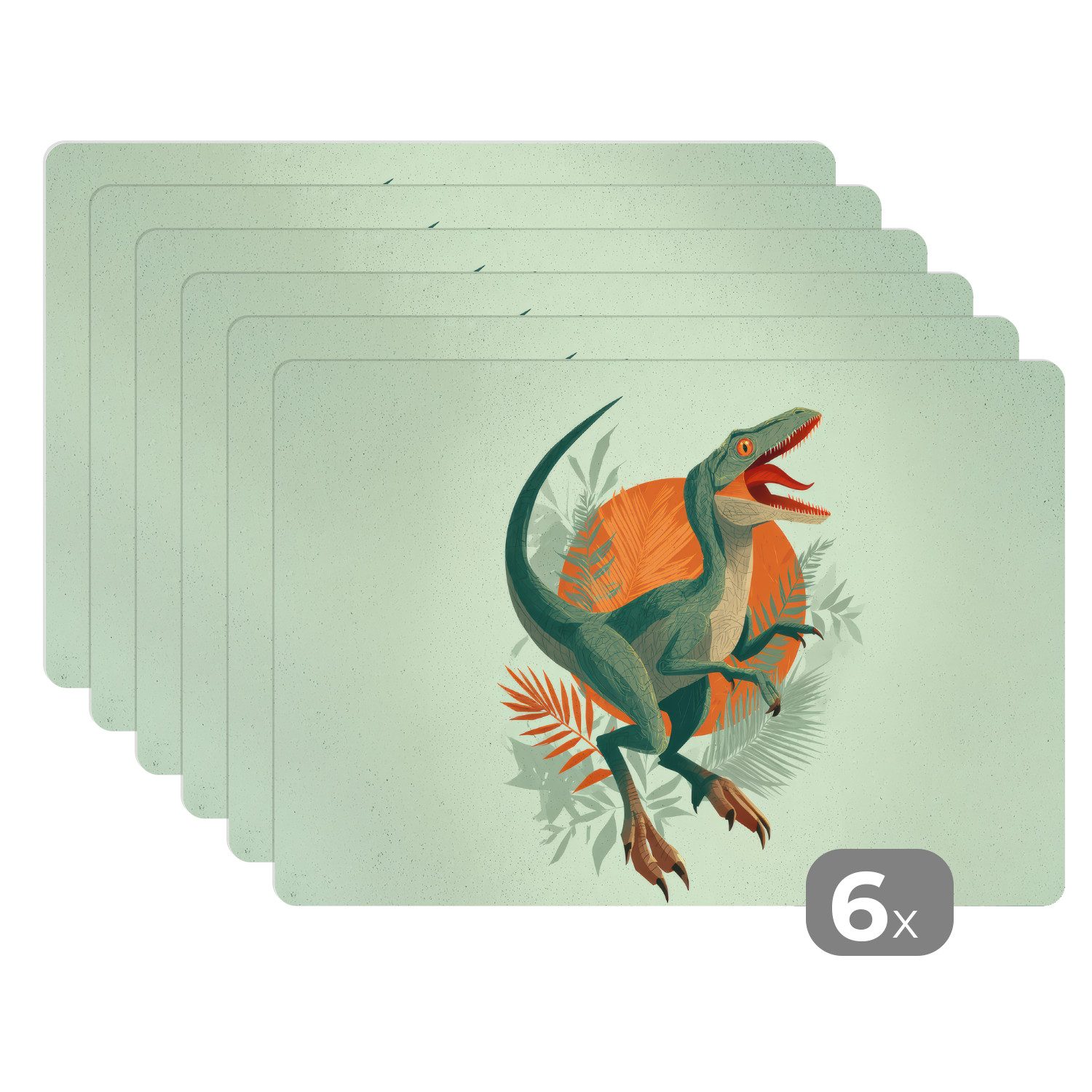 Ein grüner, velociraptorähnlicher Dinosaurier steht aufrecht mit geöffnetem Maul vor einer leuchtend orangefarbenen Sonne. Um ihn herum wachsen detaillierte Farne auf einem blassgrünen Hintergrund, der eine tropische Atmosphäre hervorruft.