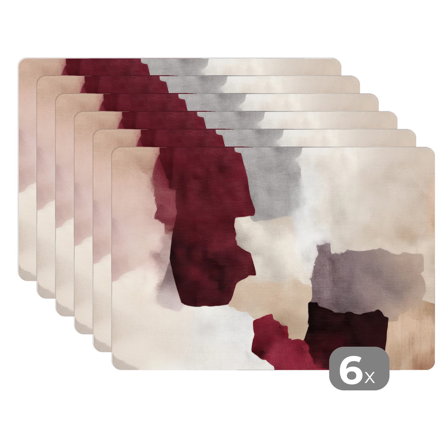 Eine abstrakte Komposition aus sich sanft überlagernden Farbflecken in Burgunderrot, Grau, Beige und Weiß. Die Flecken haben einen fließenden, organischen Charakter.