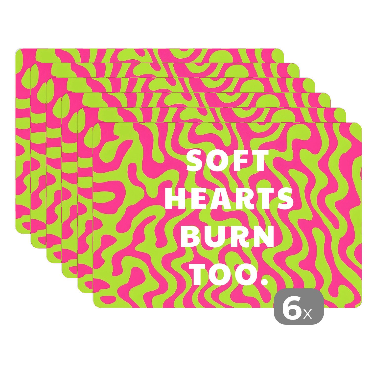 Der weiße Text "Soft Hearts Burn Too." steht im Mittelpunkt eines abstrakten rosa-grünen Musters. Das Design ist spielerisch und doch mit emotionaler Kraft aufgeladen.