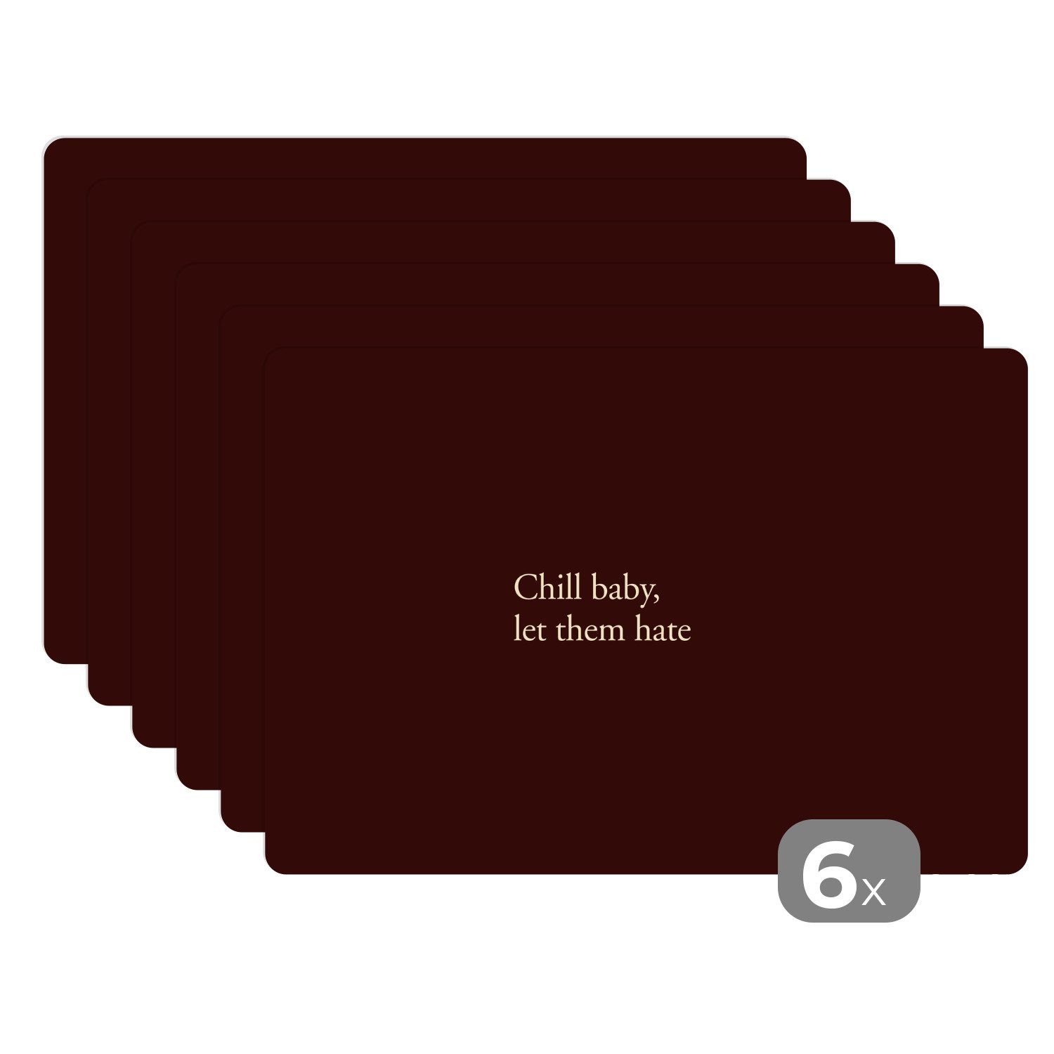 Der weiße Text auf dunkelrotem Hintergrund lautet: "Chill Baby, lass sie hassen". Die minimalistische Typografie steht im Mittelpunkt und strahlt Gelassenheit und Selbstbewusstsein aus.