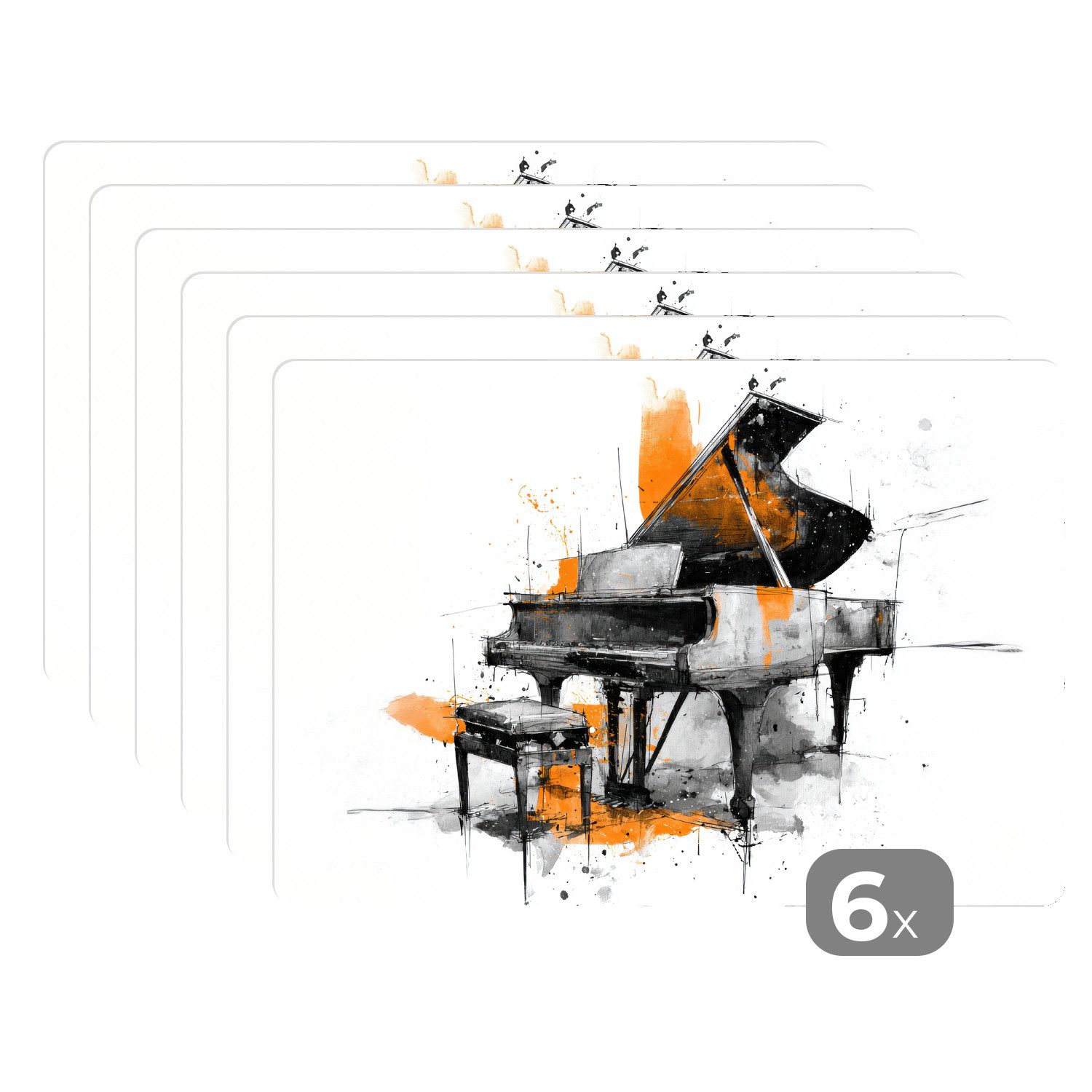 Schwarz-Weiß-Illustration eines Flügels mit Hocker, bestehend aus skizzenhaften Linien und Schattierungen. Leuchtend orangefarbene Farbspritzer heben Teile des Instruments und des Bodens hervor. Der Stil ist dynamisch und ausdrucksstark, so als ob der Klang visuell zum Leben erwacht.
