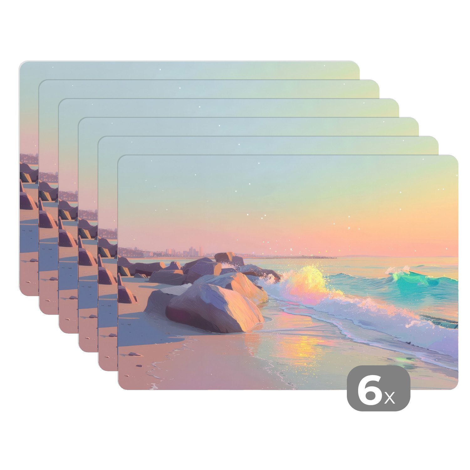 Eine sanft gefärbte Strandszene mit großen Steinen und Wellen, die gegen das Ufer schlagen, getaucht in die Pastellfarben des Sonnenaufgangs oder Sonnenuntergangs, mit funkelnden Akzenten am Himmel.