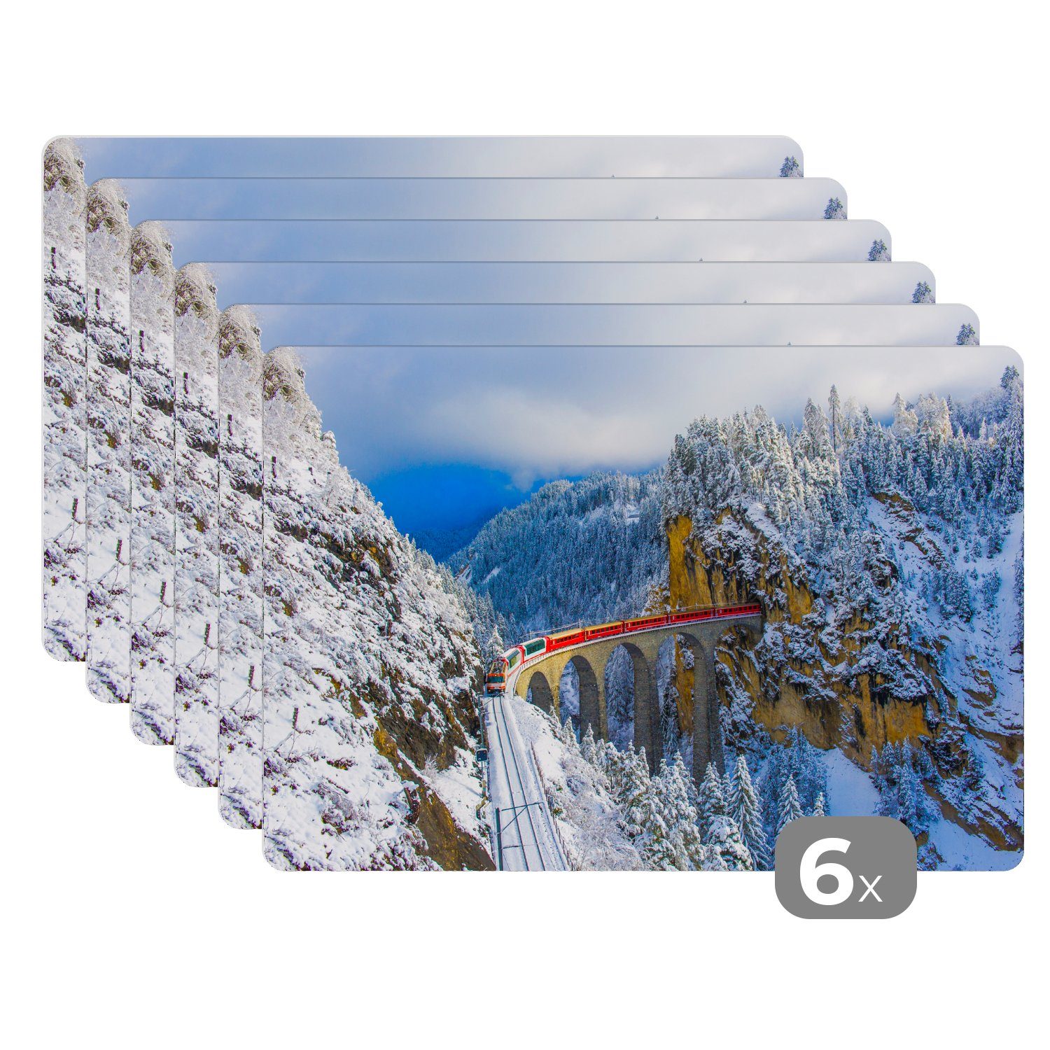 Luftaufnahme des Viadukts in der Schweiz. Die Struktur ist von verschneiten Bäumen umgeben. Diese Ansicht kommt im Wohnzimmer gut zur Geltung.