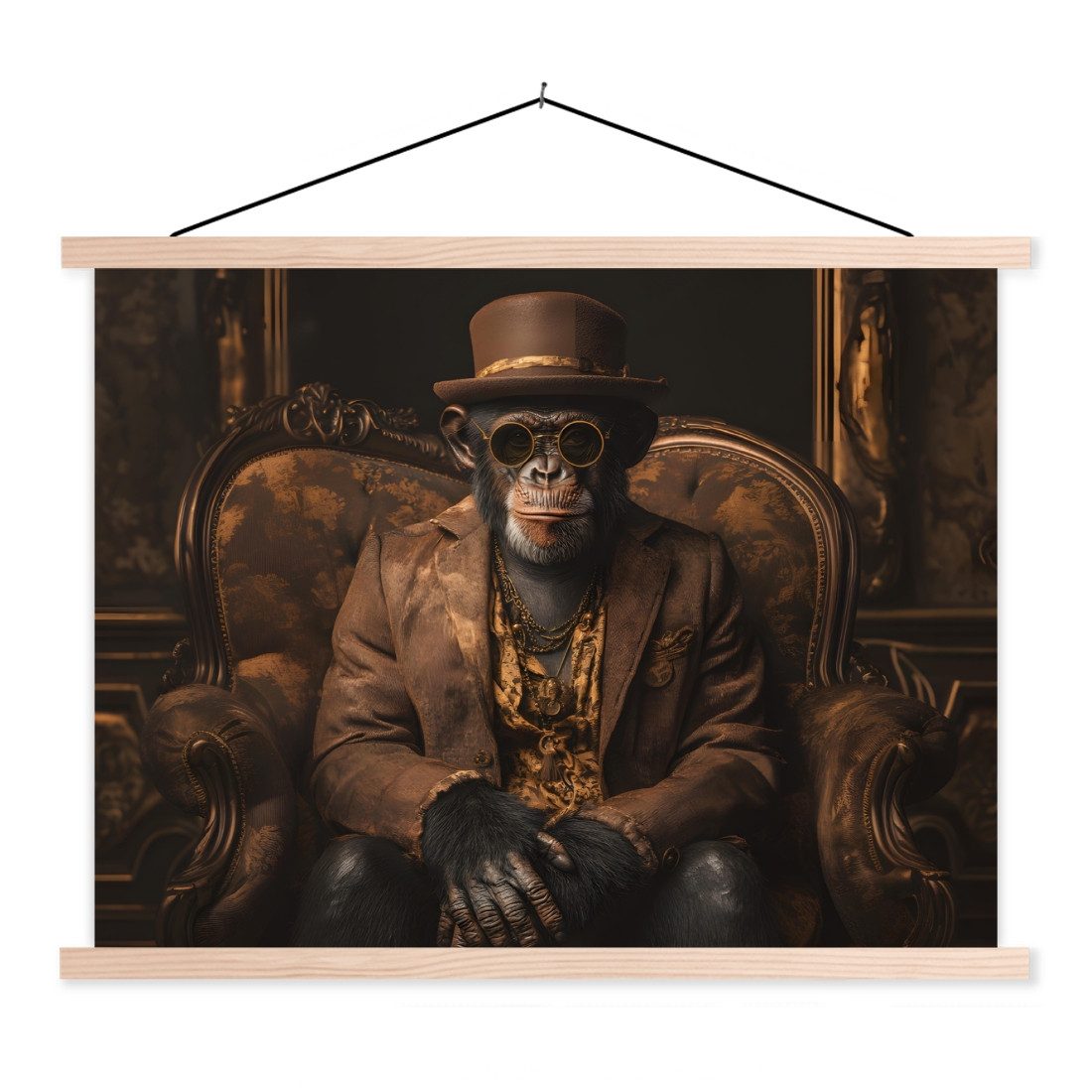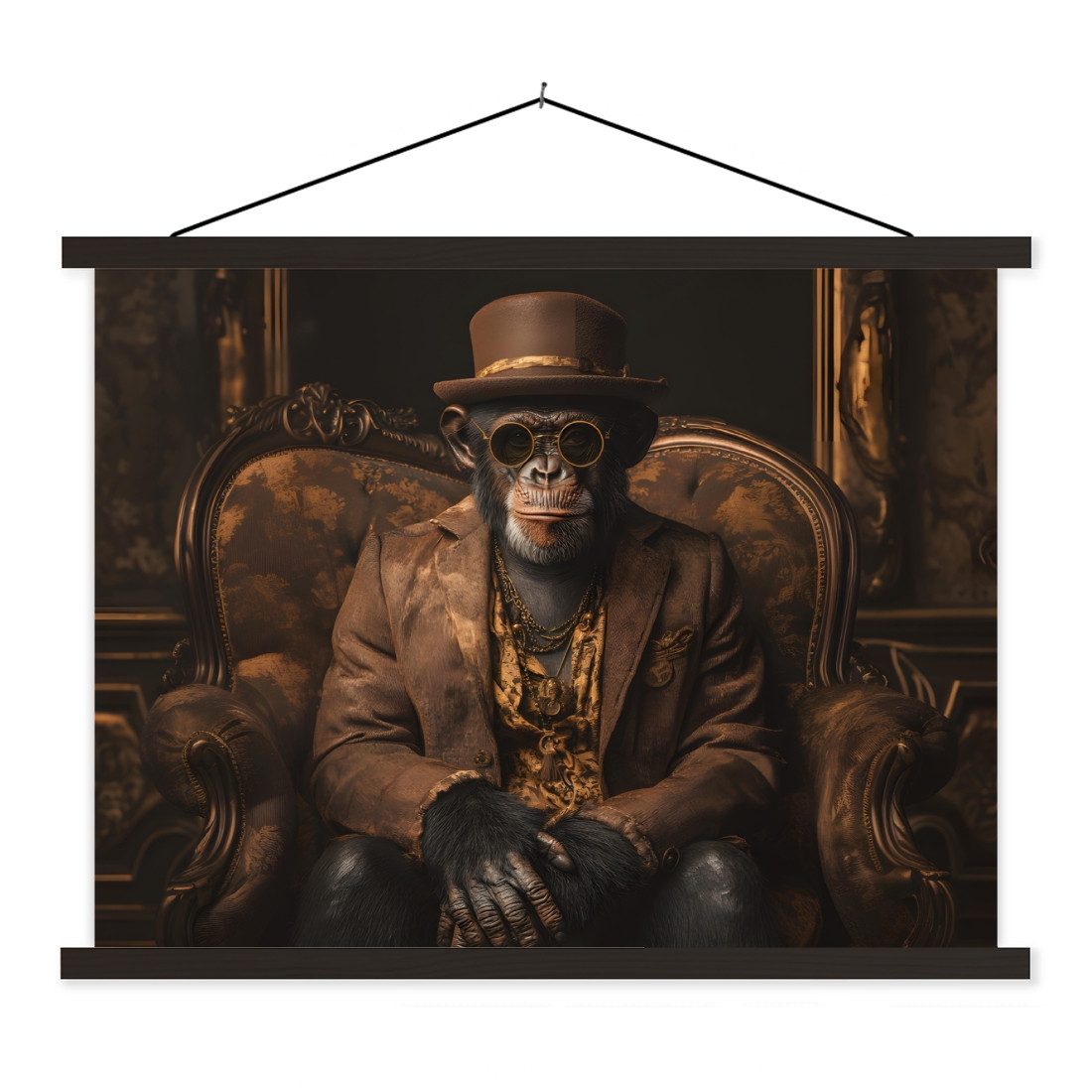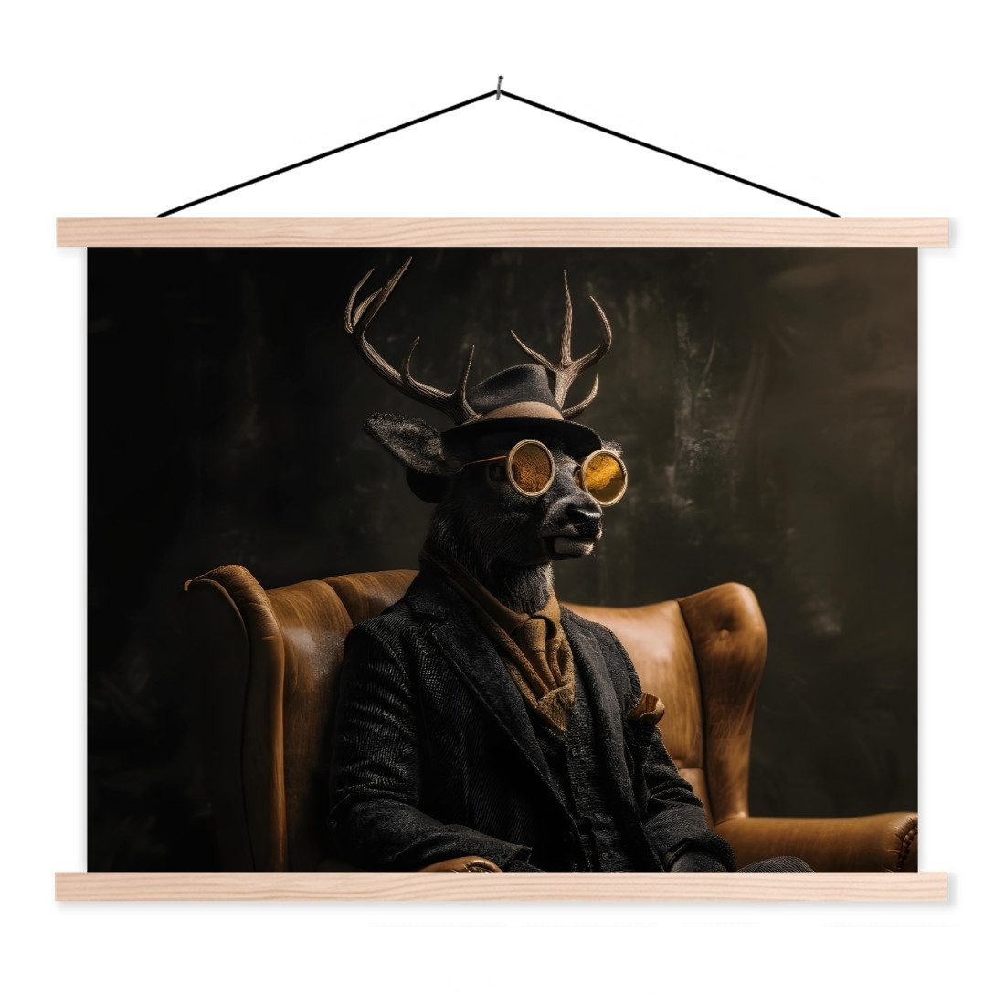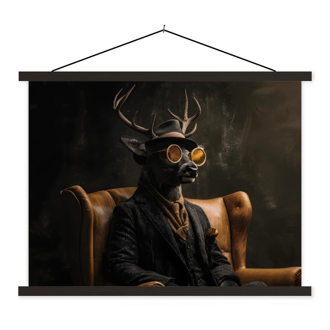 Ein Hirsch mit Hut und orangefarbener Sonnenbrille sitzt stolz in einem Ledersessel, gekleidet in einen eleganten schwarzen Anzug.