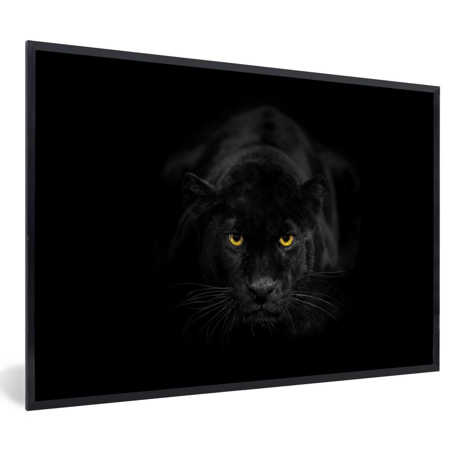 Ein schwarzer Panther mit auffälligen Augen auf schwarzem Hintergrund.