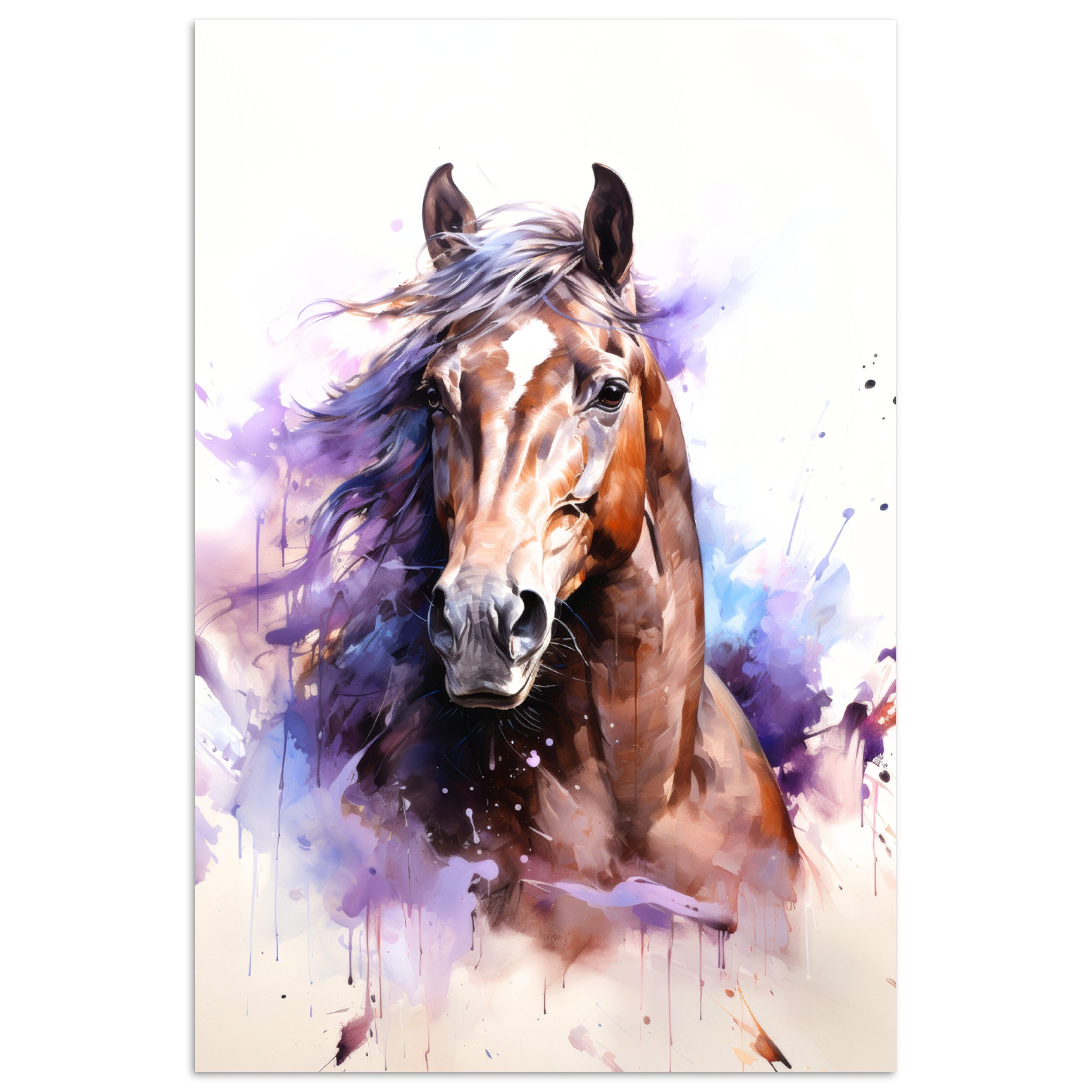 Ein braunes Pferd mit lila Farbe auf weißem Hintergrund.