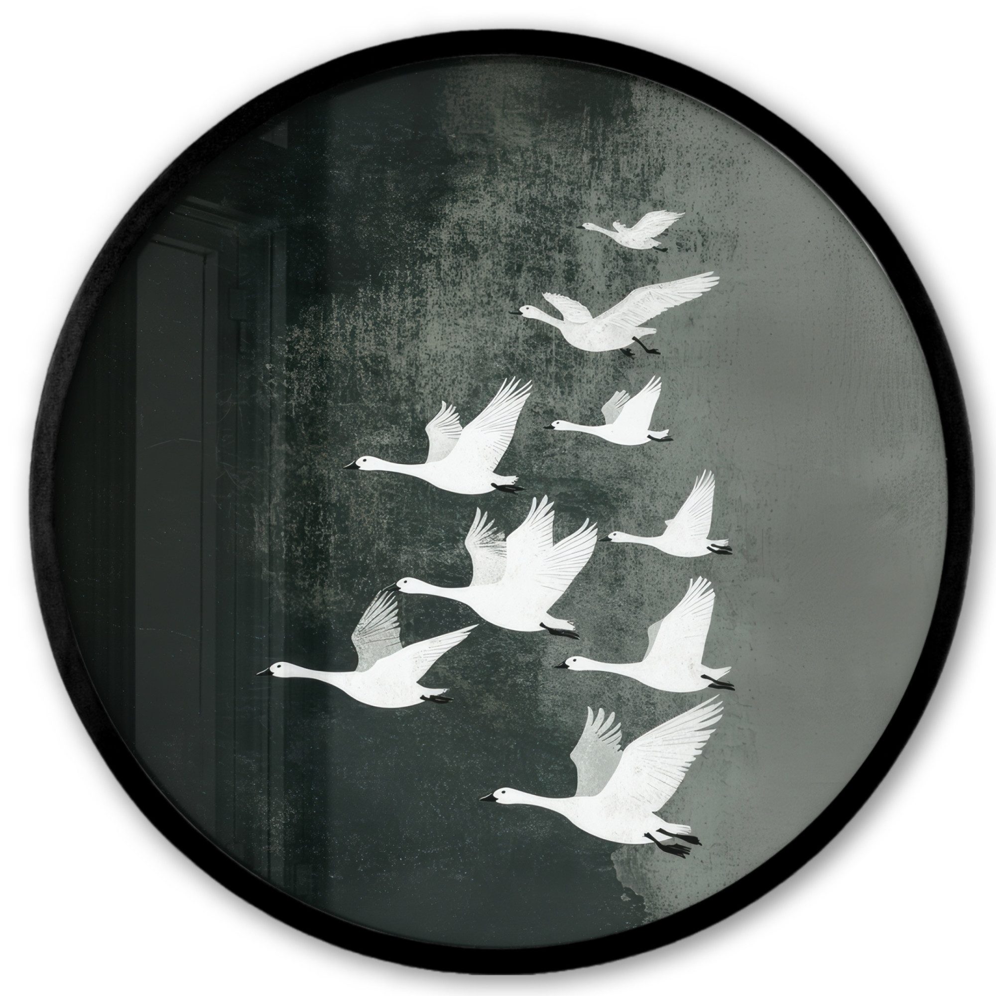 Eine Gruppe von Vögeln fliegt vor einem großen, weichen Mond vor einem verschwommenen, verträumten Hintergrund.