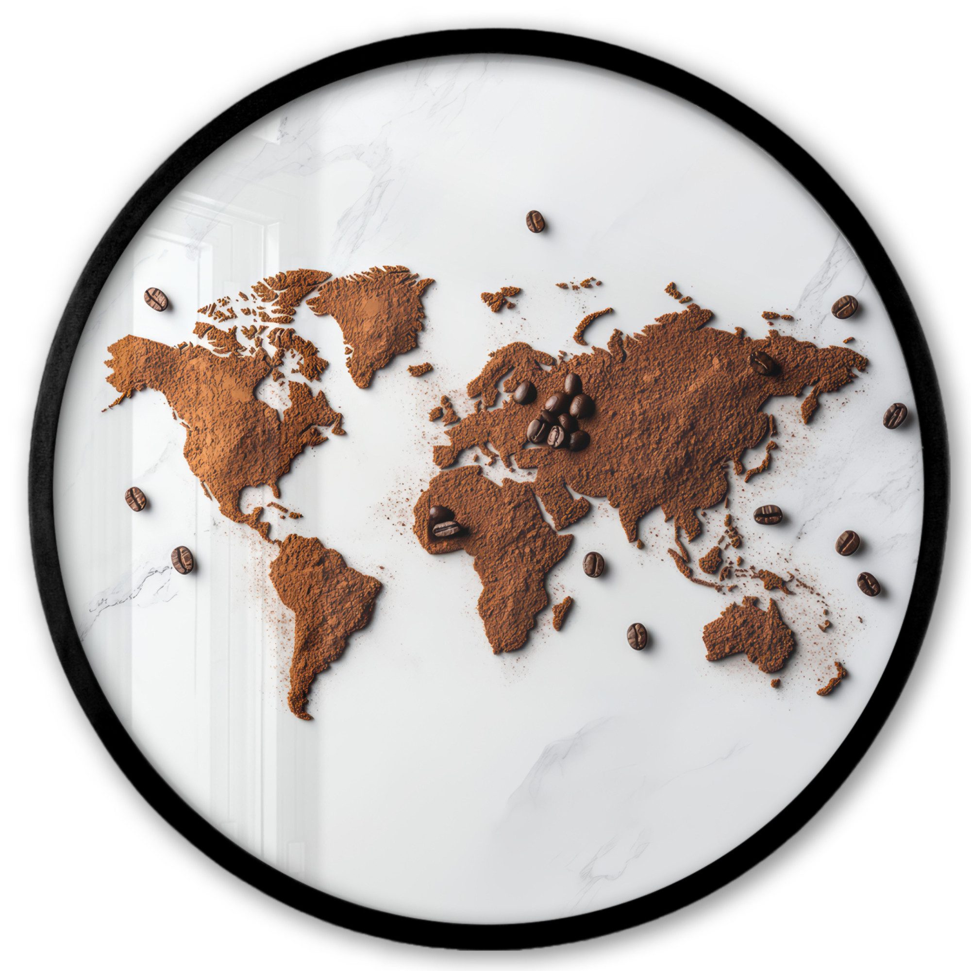 Weltkarte mit gemahlenen Kaffeebohnen auf weißem Marmorhintergrund.