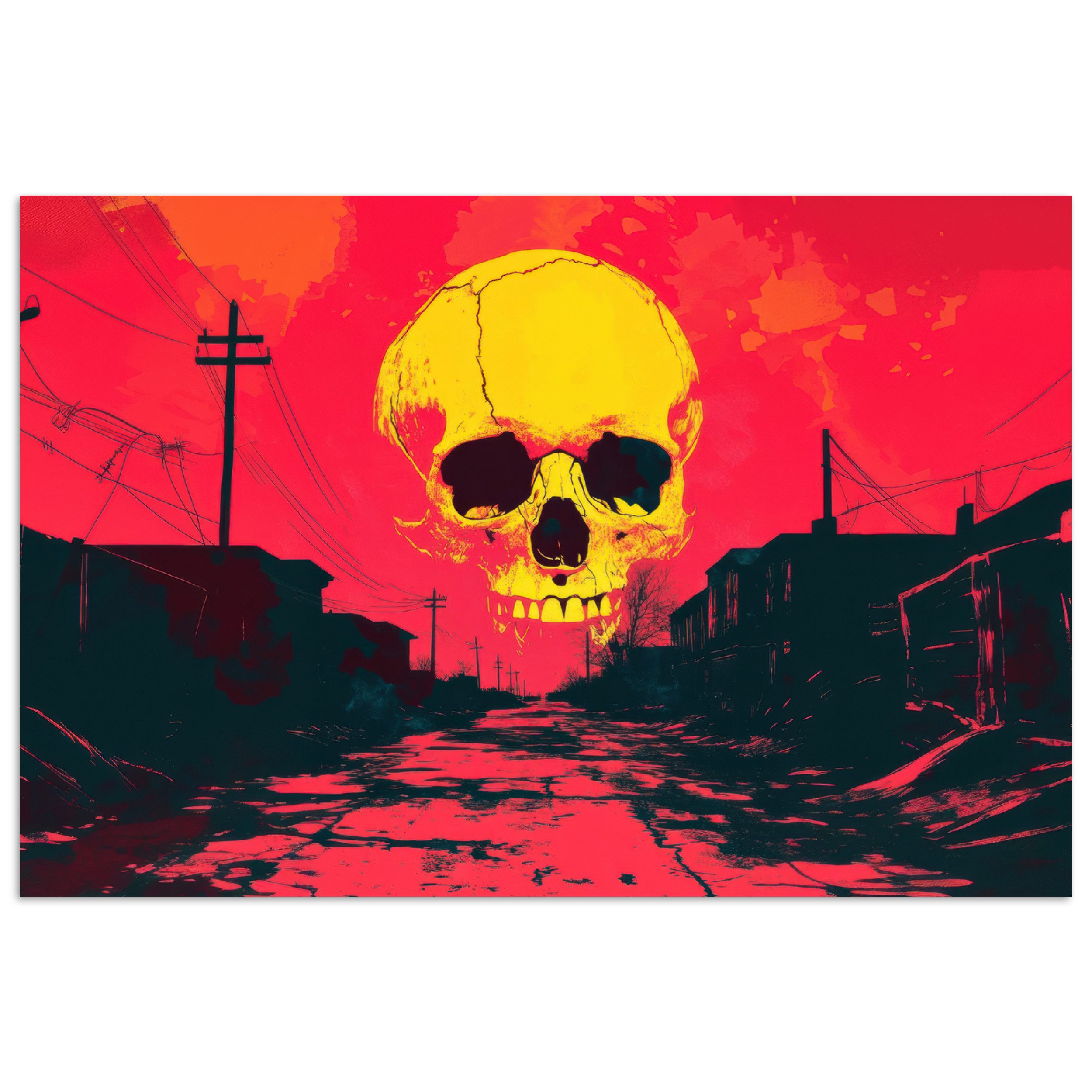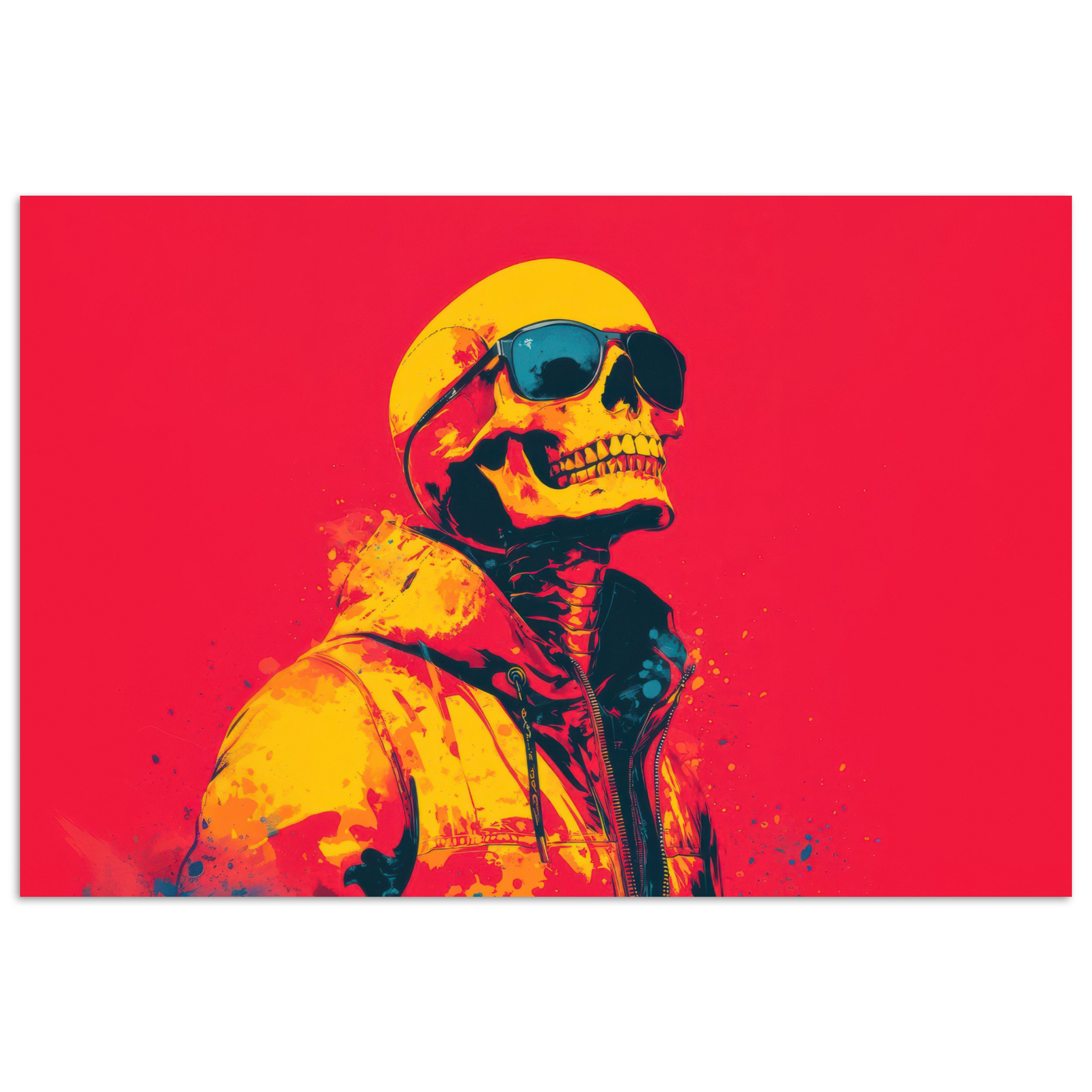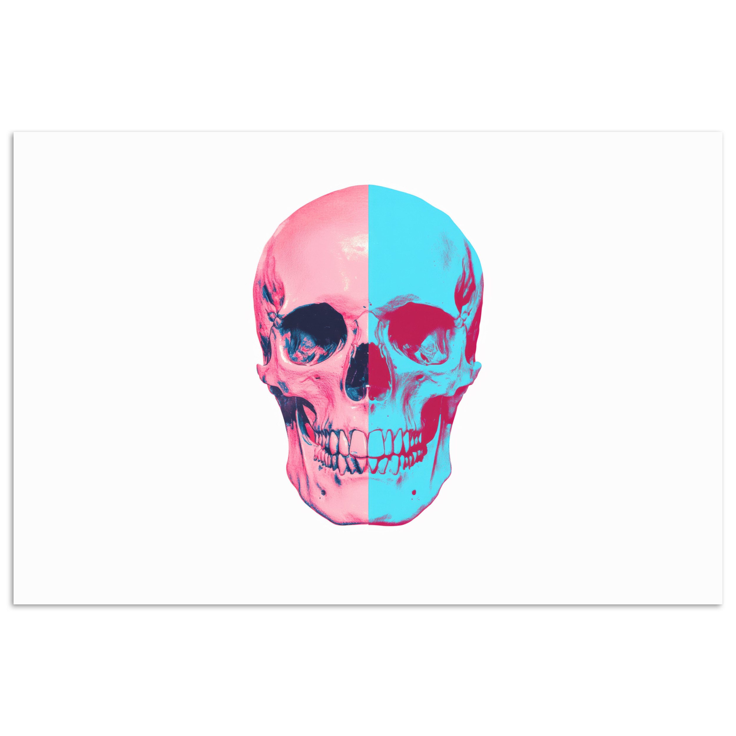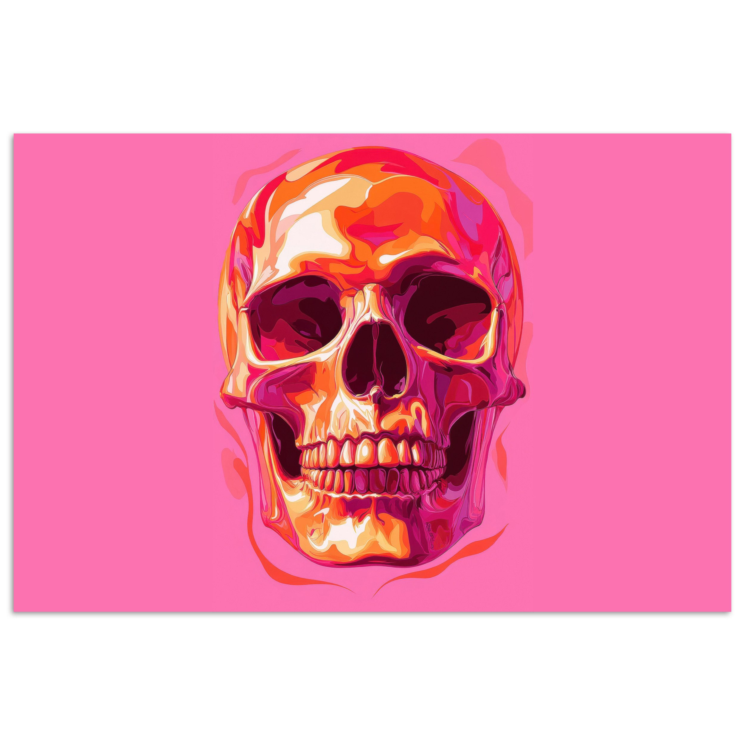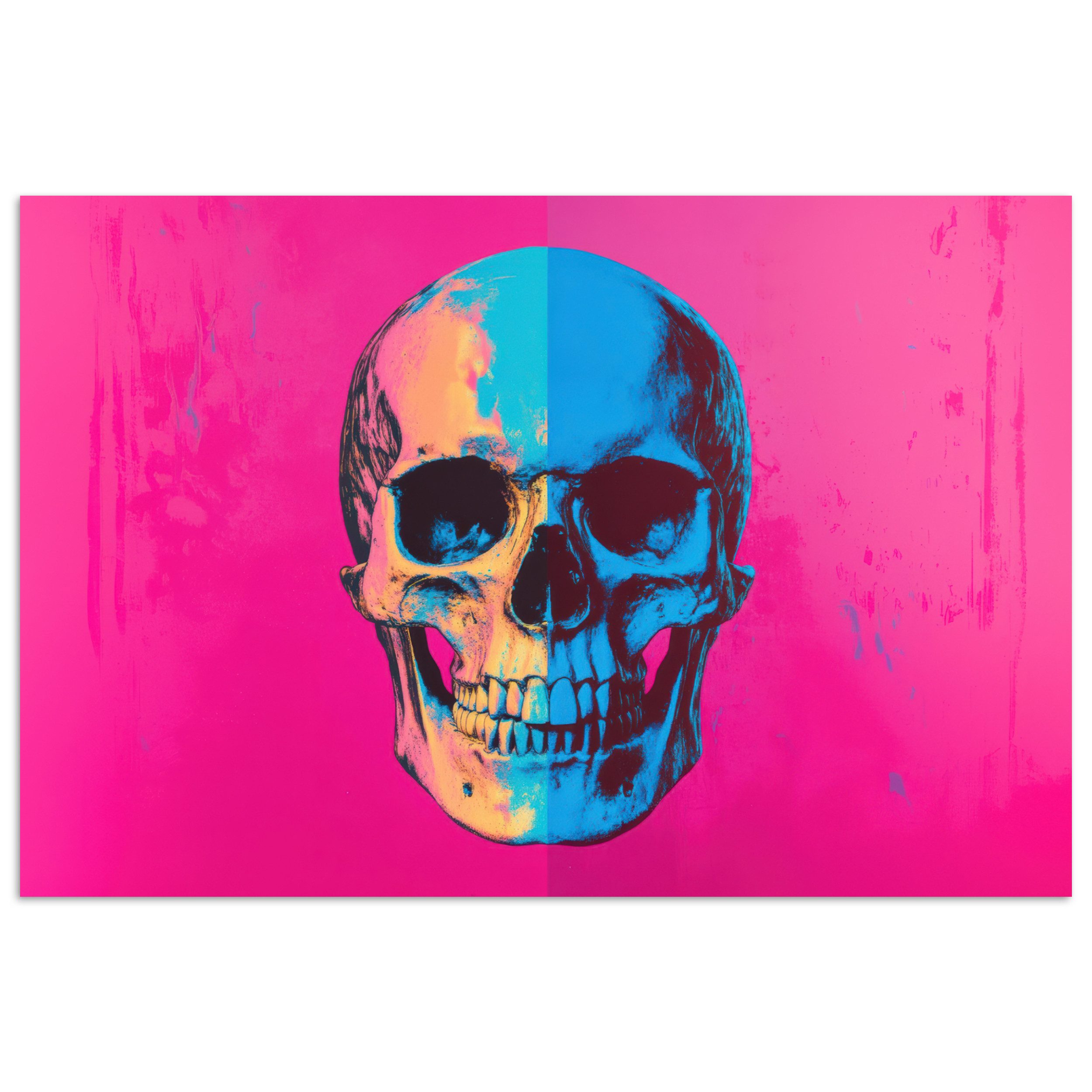 Totenkopf in Neongelb und Blau mit einem leuchtend rosa Hintergrund. Der Stil strahlt Pop-Art-Energie aus.