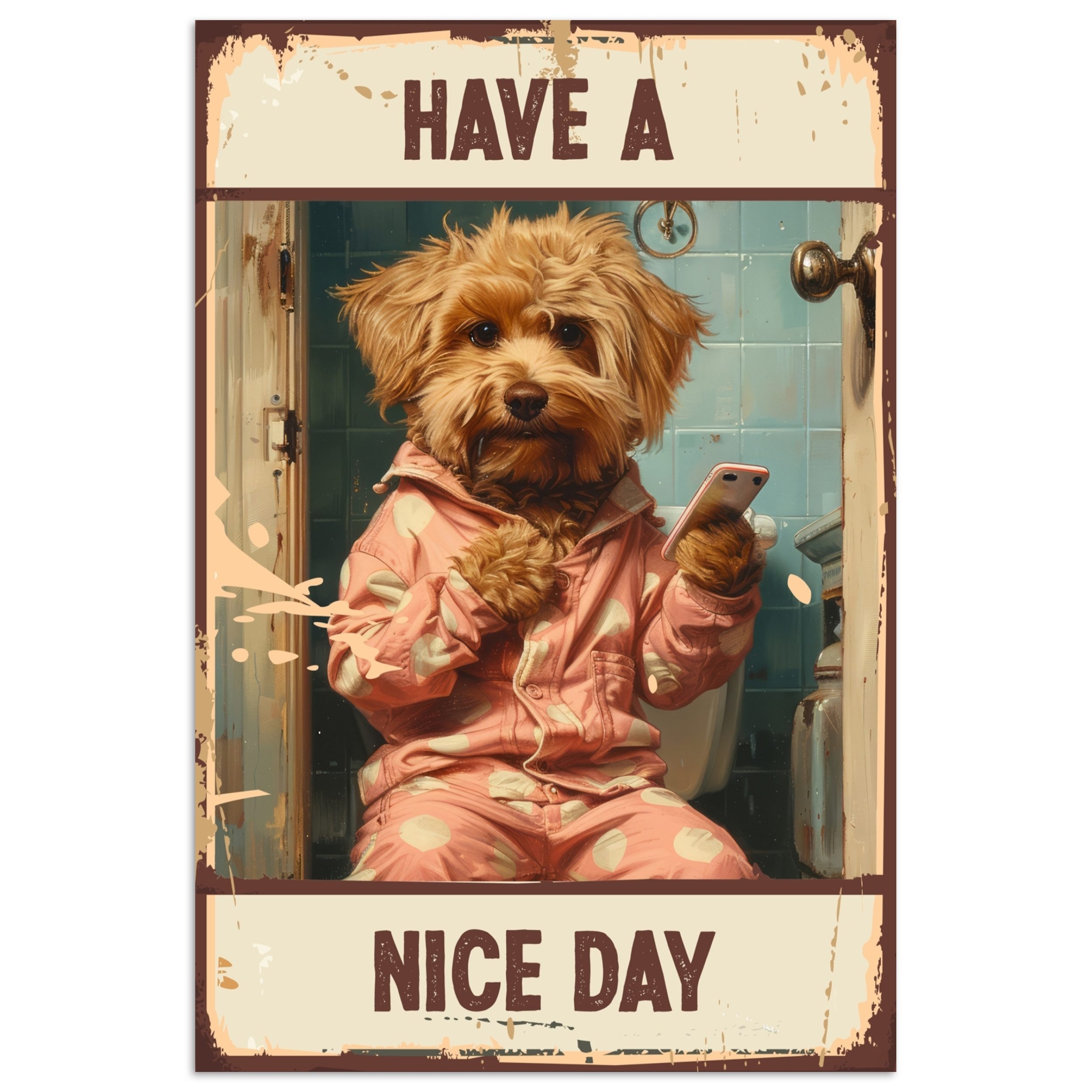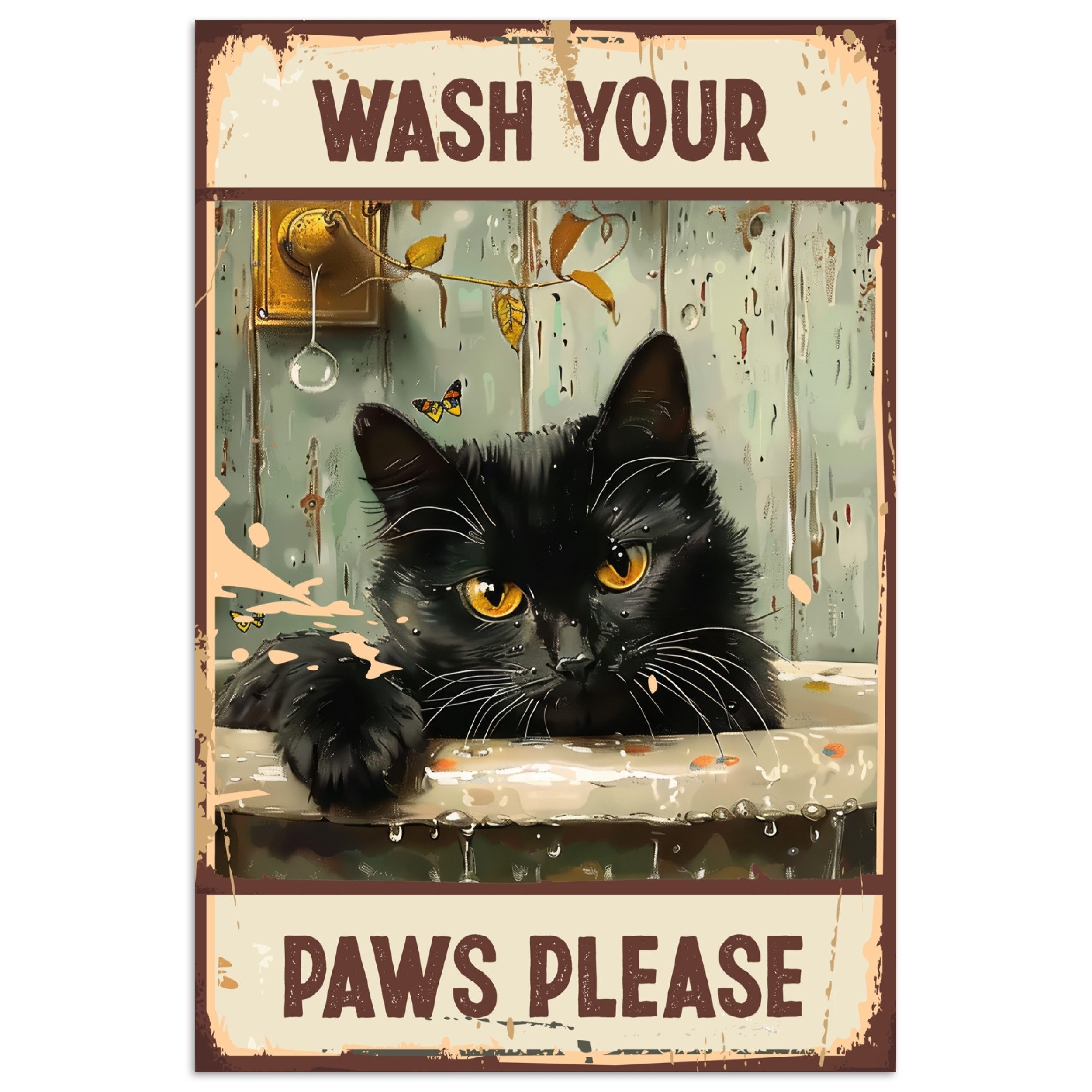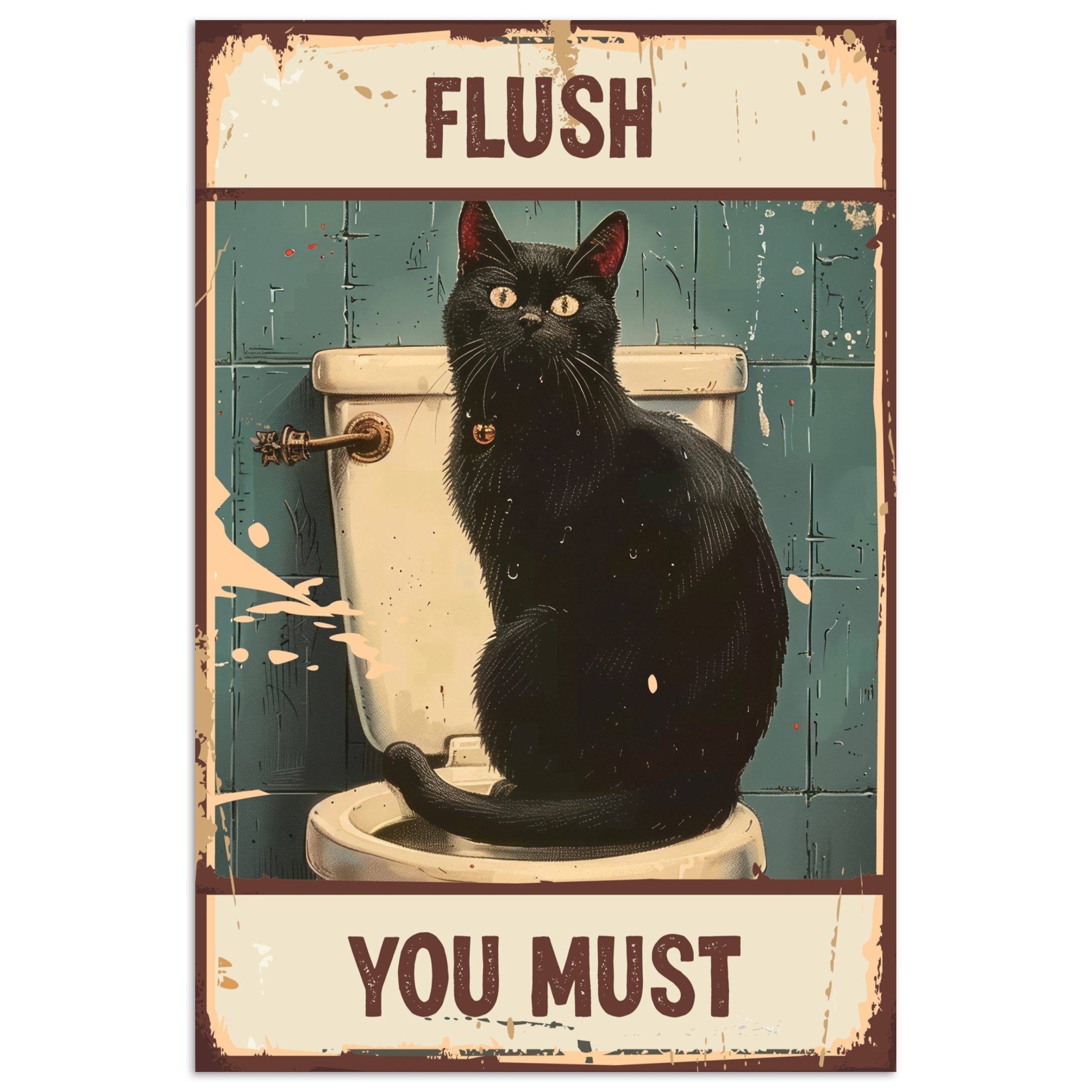 Ein altes Schild mit dem Zitat "Flush you must" und einer Katze.