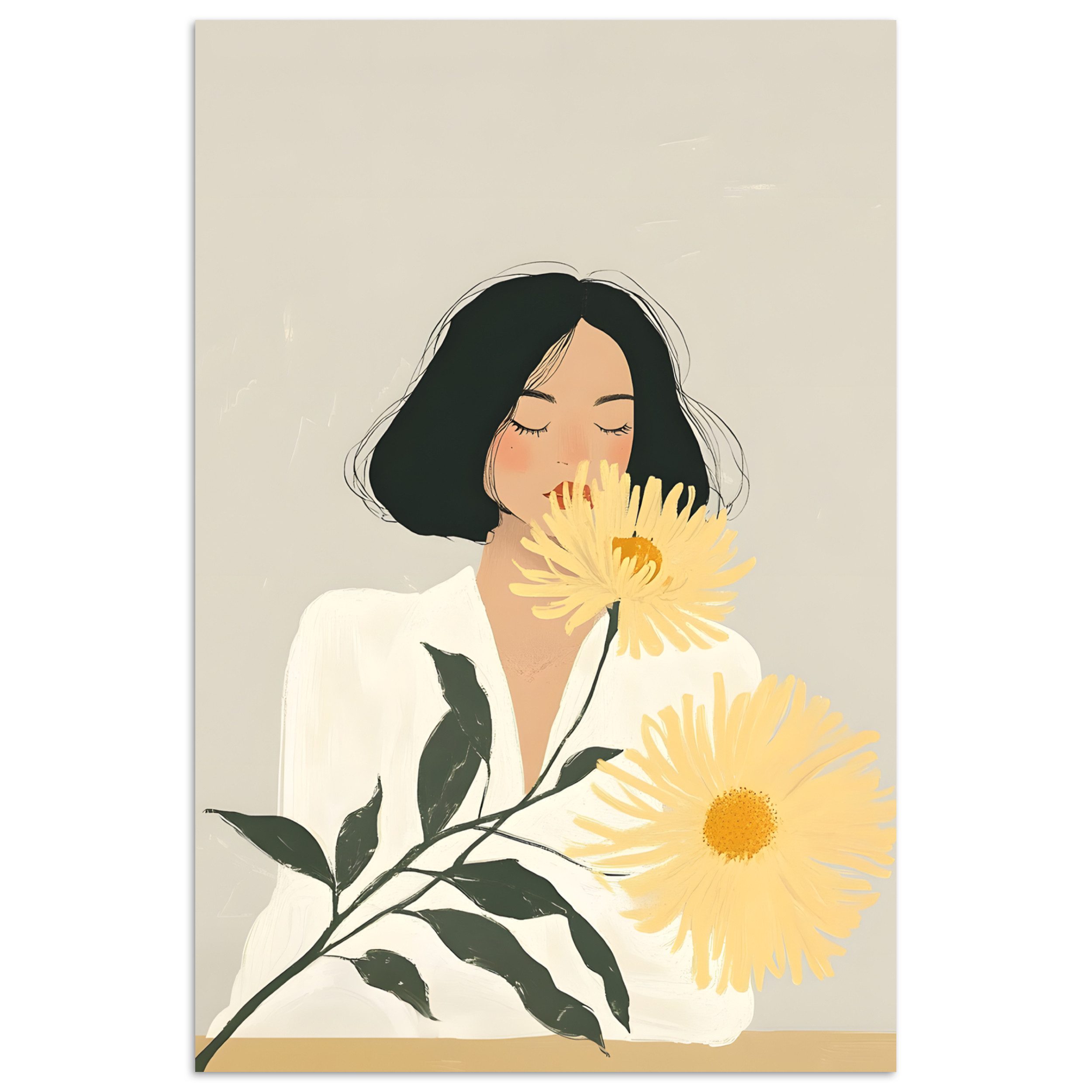 Eine Frau mit kurzen schwarzen Haaren schnuppert an einer großen gelben Blume, die vor einem weichen grau-beigen Hintergrund abgebildet ist.