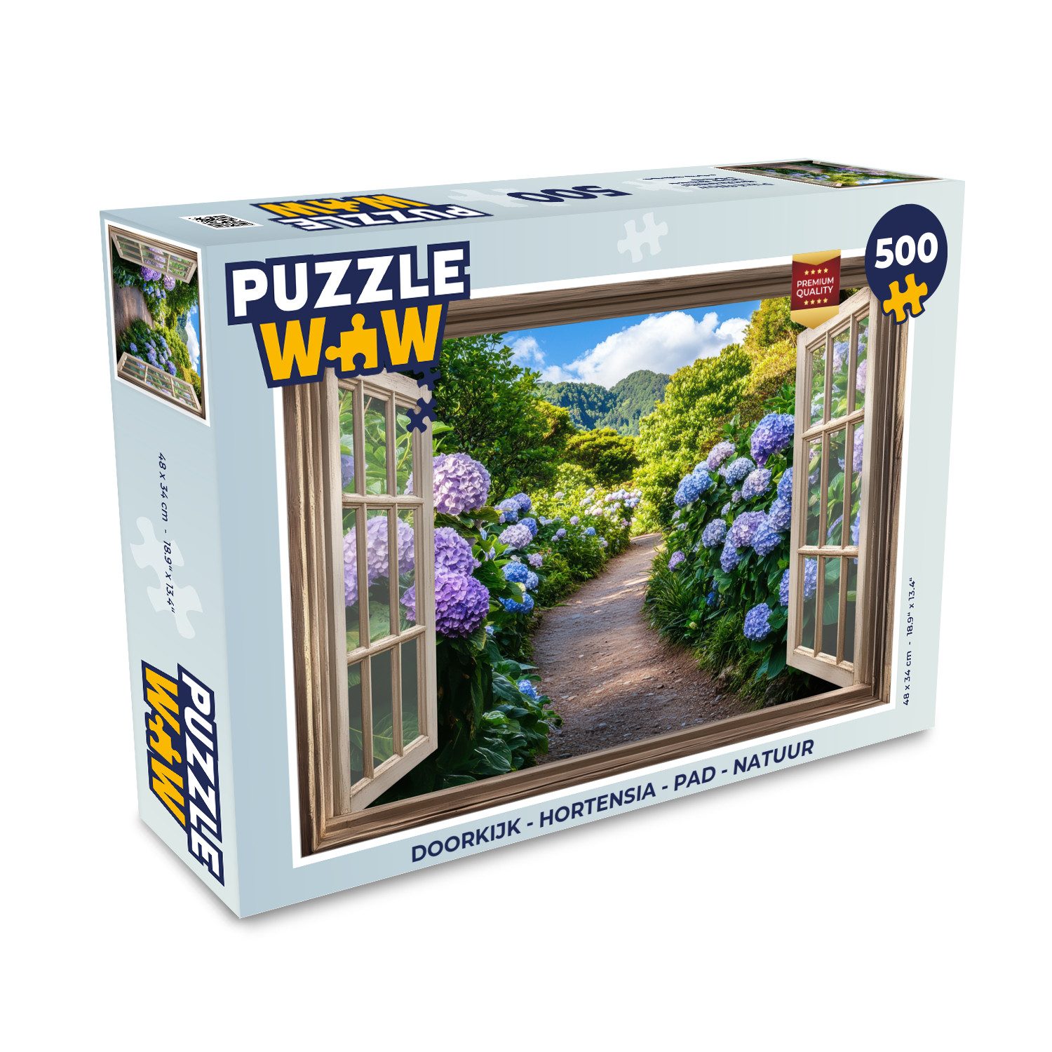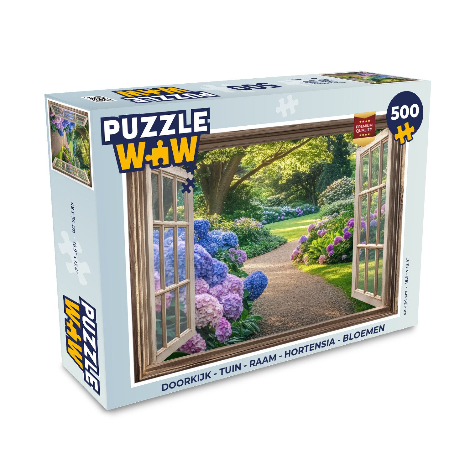 Blick auf einen üppigen Garten durch ein offenes Fenster. Ein gewundener Weg führt durch die grüne Landschaft, umgeben von blühenden Hortensien in wunderschönen Blau- und Violetttönen.Breite | 34 cm |