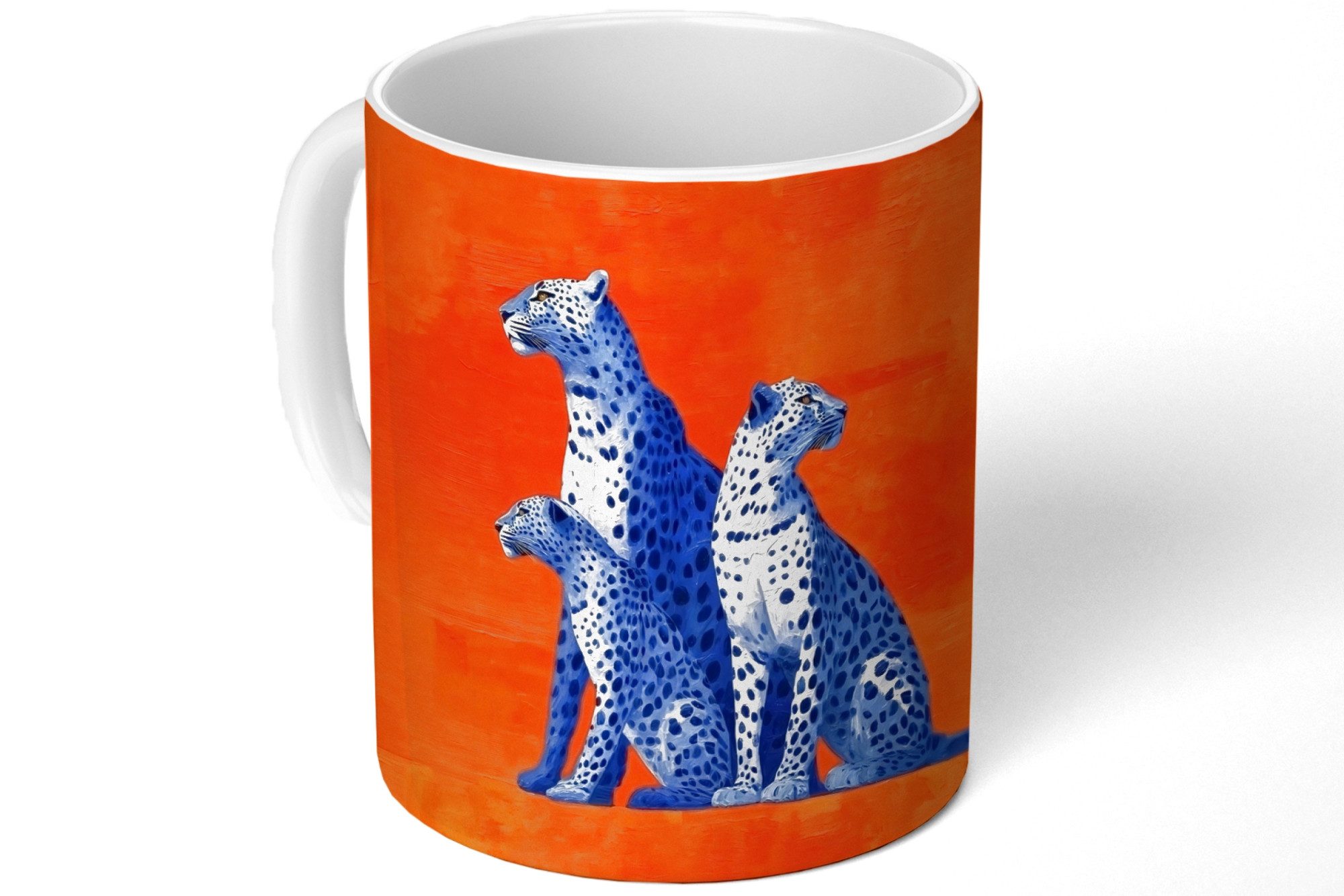 Drei blaue Leoparden sitzen in verschiedenen Posen vor einem leuchtend orangefarbenen Hintergrund. Ihr Fell hat dunkle Punkte, und die Komposition wirkt grafisch und auffällig.