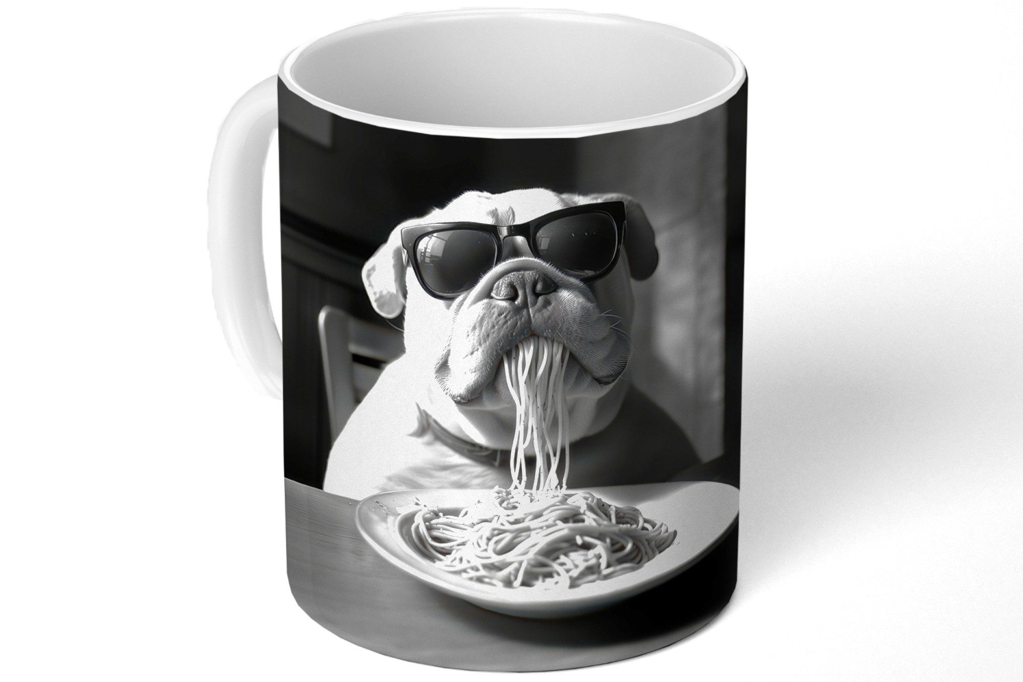 Eine Bulldogge mit dunkler Sonnenbrille sitzt vor einem Teller mit Spaghetti und schlürft lässig ein paar Stränge. Der Kontrast zwischen dem muskulösen, ernsten Blick des Hundes und der lustigen Situation verleiht der Szene einen spielerischen Charme. Das weiche Licht unterstreicht die Falten und die Textur seines Fells.