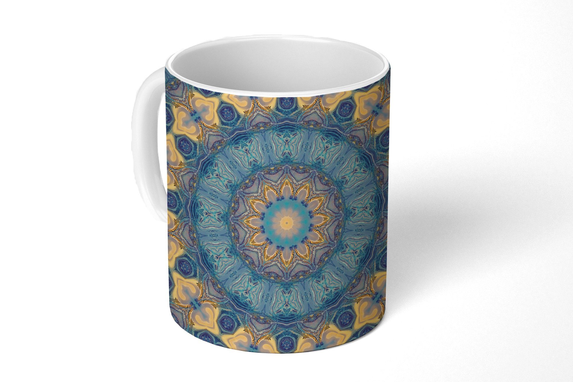 Ein Bild eines indischen Mandalas mit blauen und gelben Farben, in das verschiedene Kreisformen eingearbeitet sind.