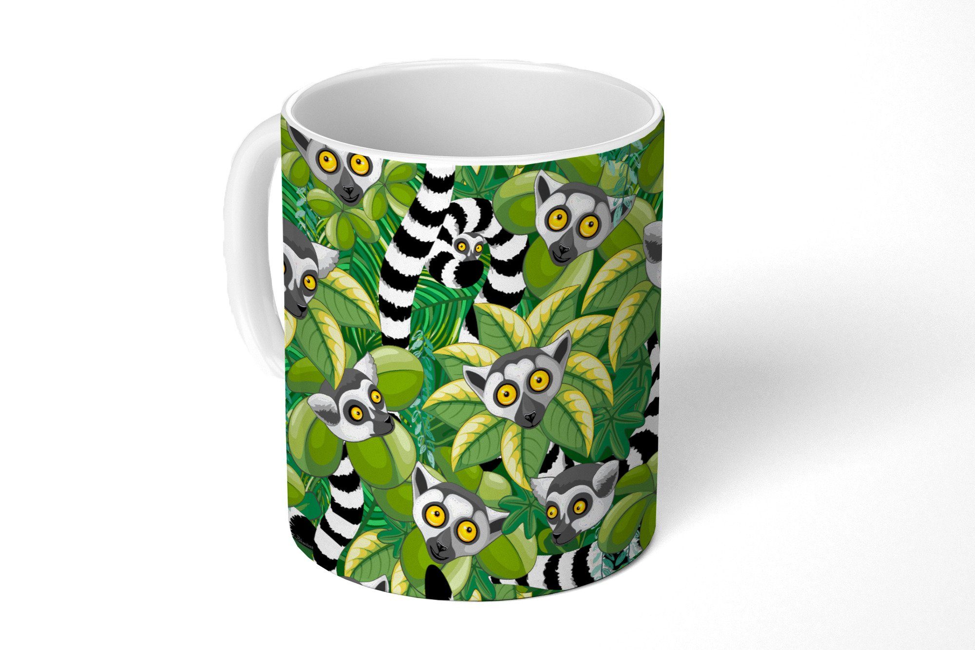 Ein Dschungelmuster von Ringelschwanzlemuren inmitten von Blättern.