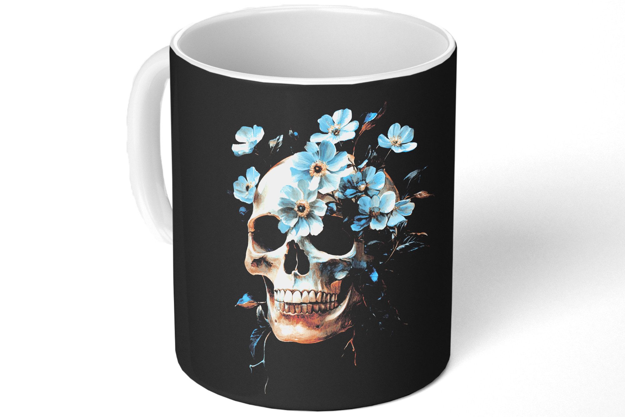 Schädel umrahmt mit zartblauen Blüten und Blättern. Die Kombination aus Knochenstruktur und Blüten wirkt poetisch und heiter.