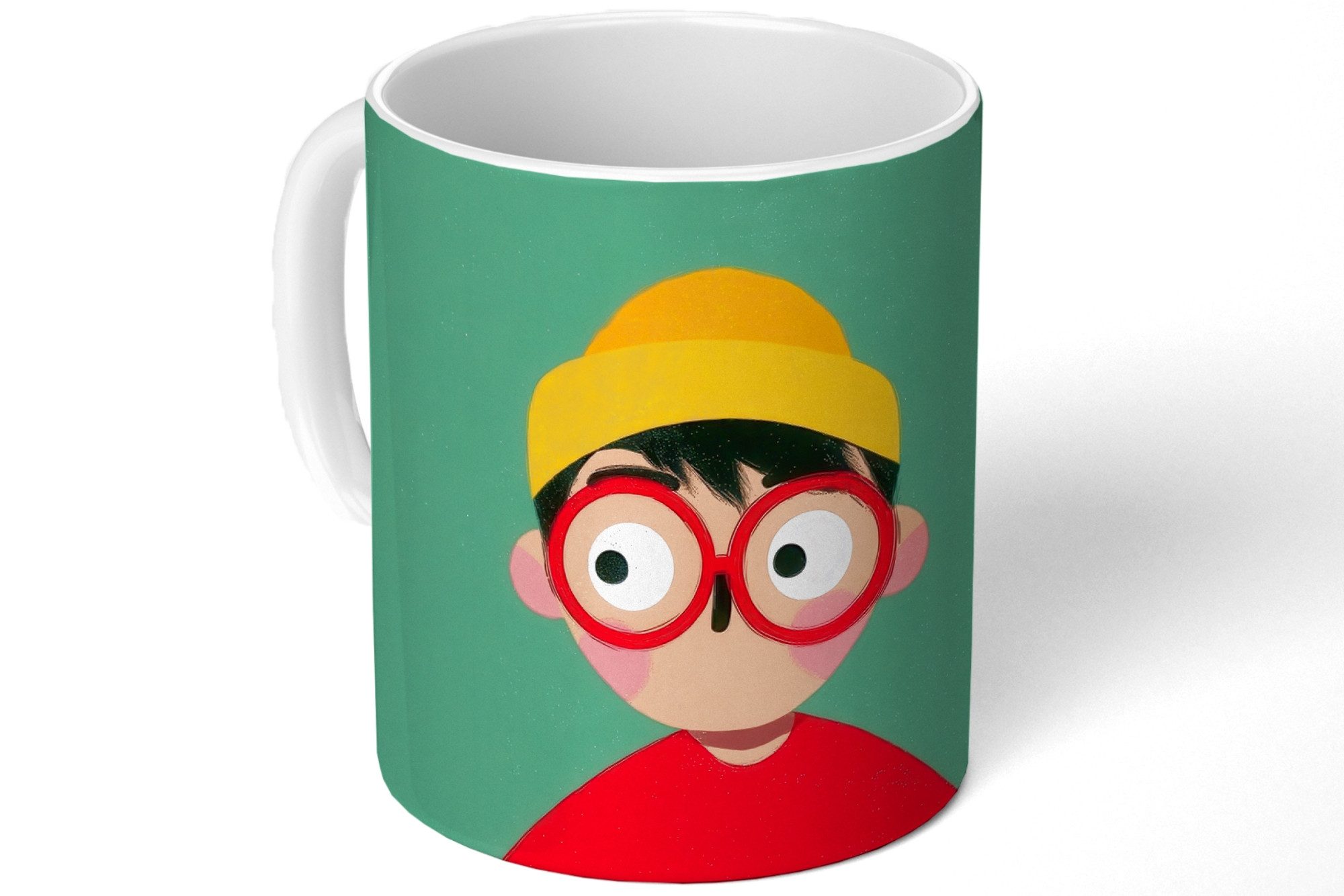 Ein cartoonhafter Junge mit großer roter Brille, rotem Pullover und gelbem Hut schaut verwirrt vor einem grünen Hintergrund.