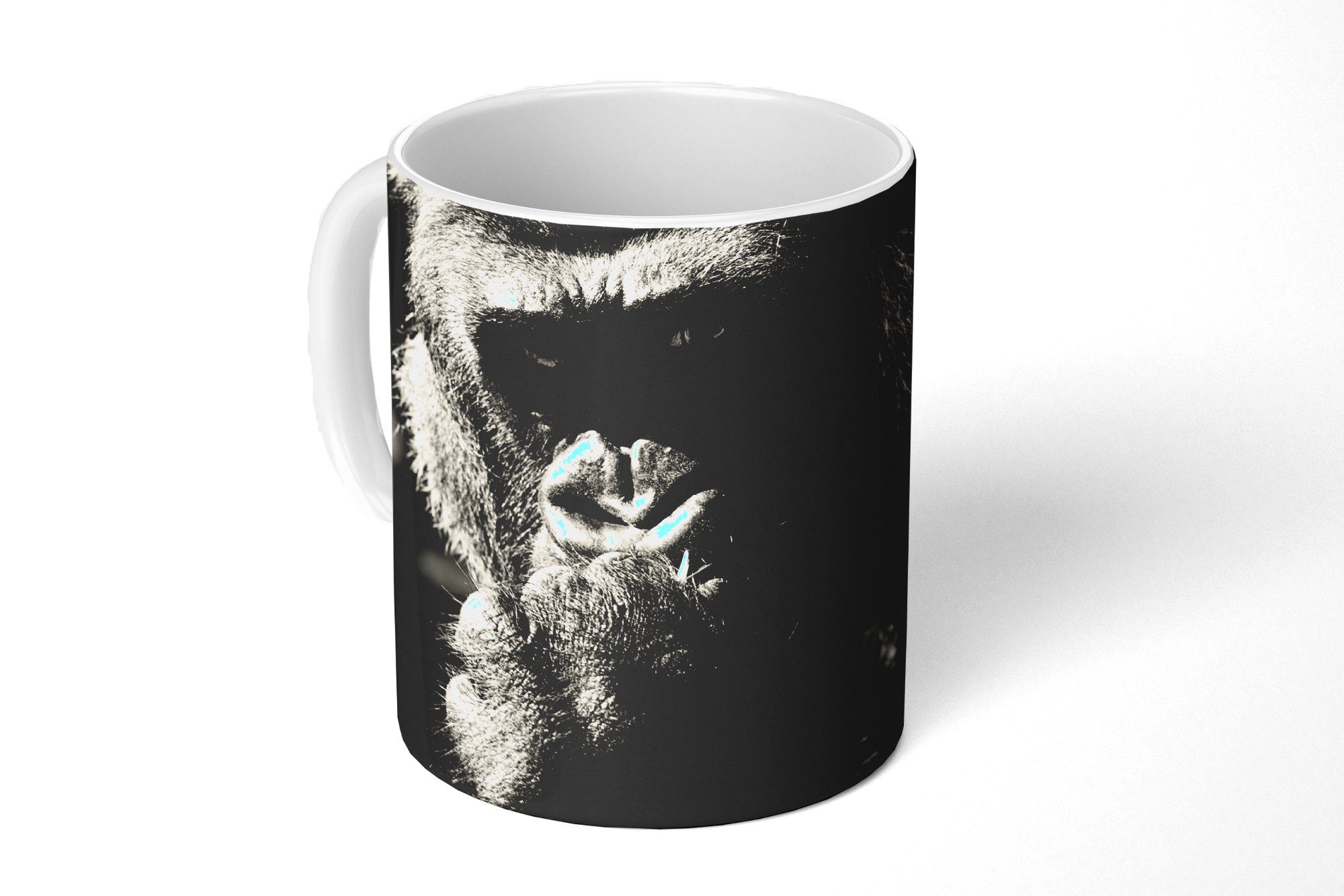 Close up Schwarz-Weiß-Bild eines Gorillas vor einem schwarzen Hintergrund. Die Konturen des Gorillas heben sich gut von dem verblassten Hintergrund ab.