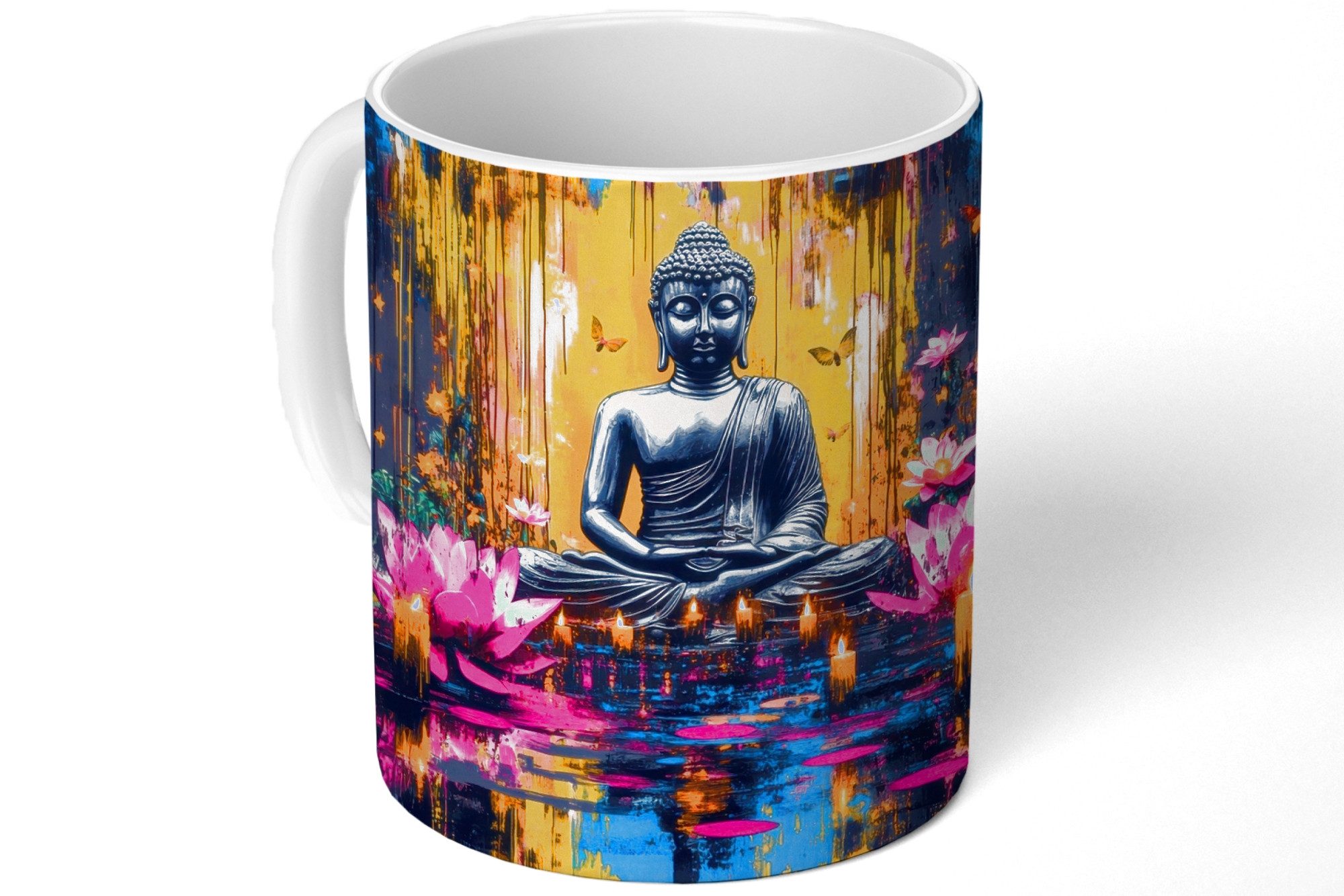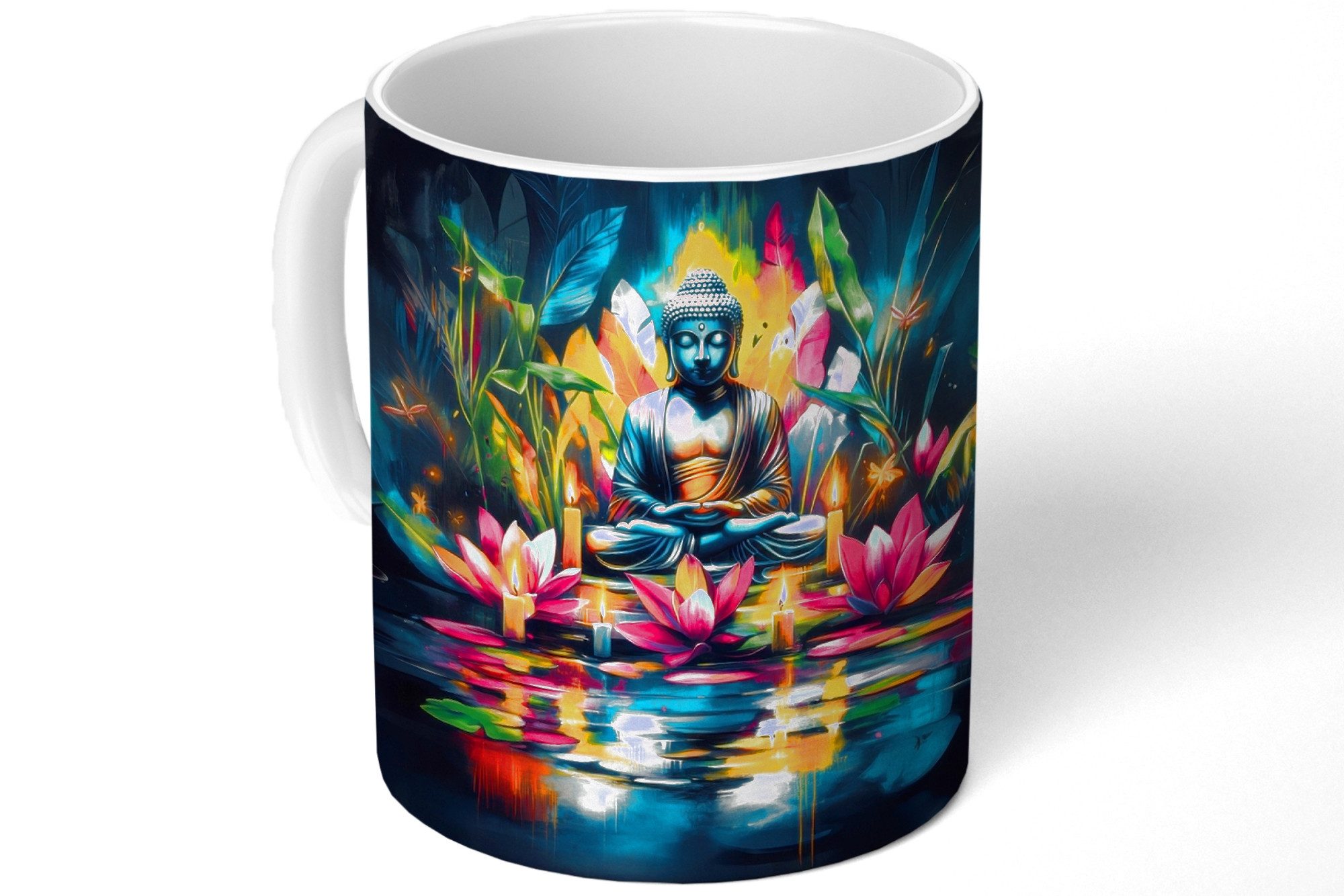 Ein Buddha sitzt in Meditation auf einer Wasseroberfläche, umgeben von rosa Lotusblumen und brennenden Kerzen. Der Hintergrund ist in leuchtenden Farben wie Gelb, Blau und Rosa gehalten und schafft eine mystische und heitere Atmosphäre.