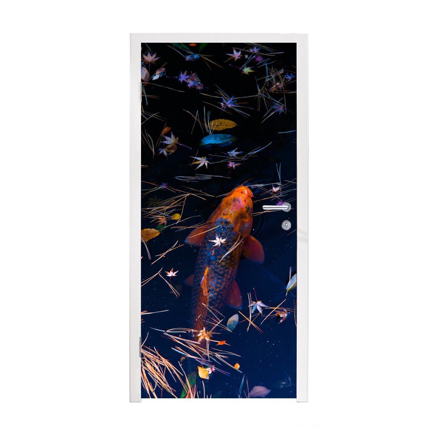 Dieser farbige Koi-Karpfen ist in einem Teich zu sehen. Der Koi-Karpfen hebt sich gut von dem dunklen Wasser ab. Das Bild erzeugt einen einzigartigen Effekt.
