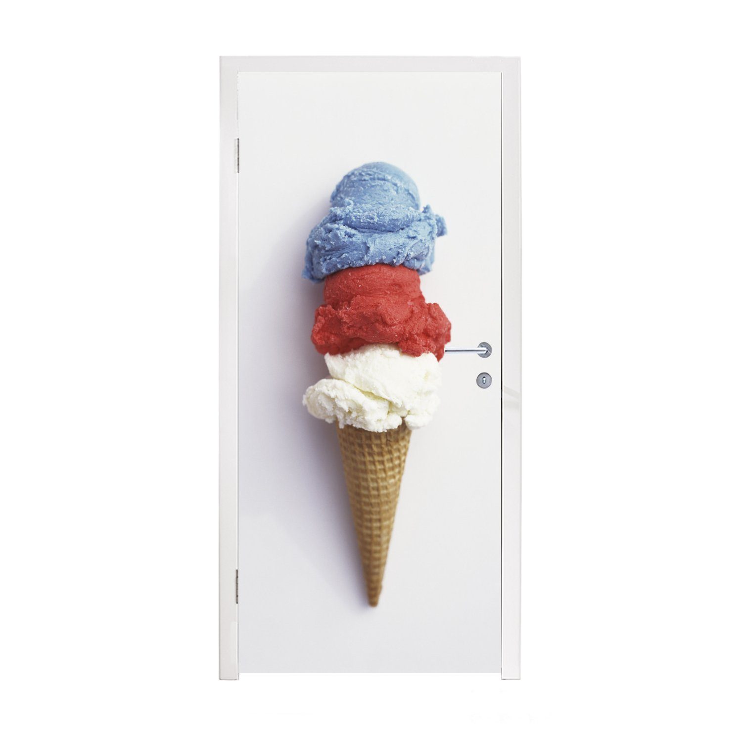 Dieses beeindruckende Foto zeigt eine Eistüte mit drei verschiedenen Geschmacksrichtungen vor einem weißen Hintergrund.