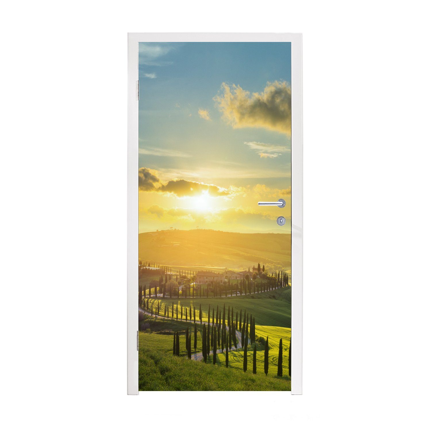 Die Sonne scheint auf die Landschaft der italienischen Toskana.