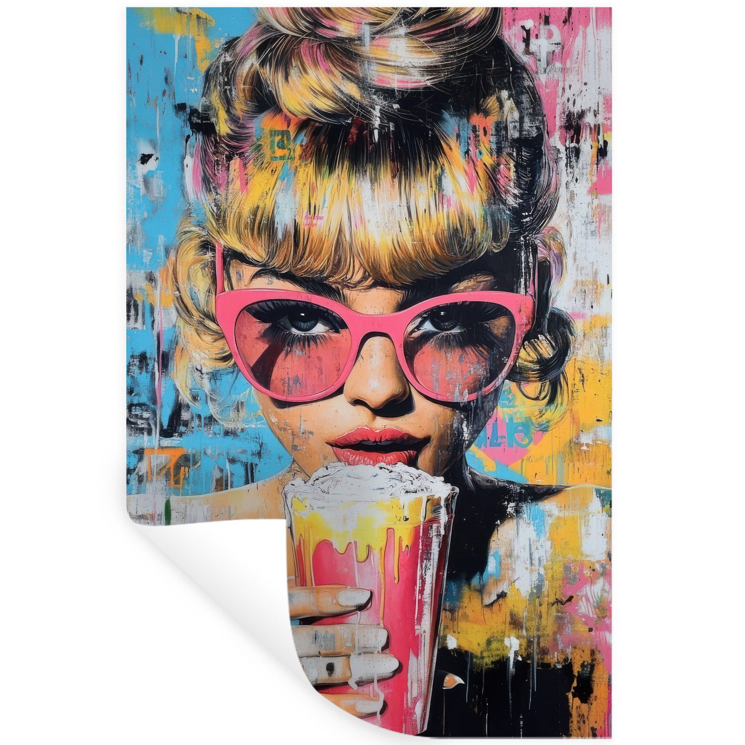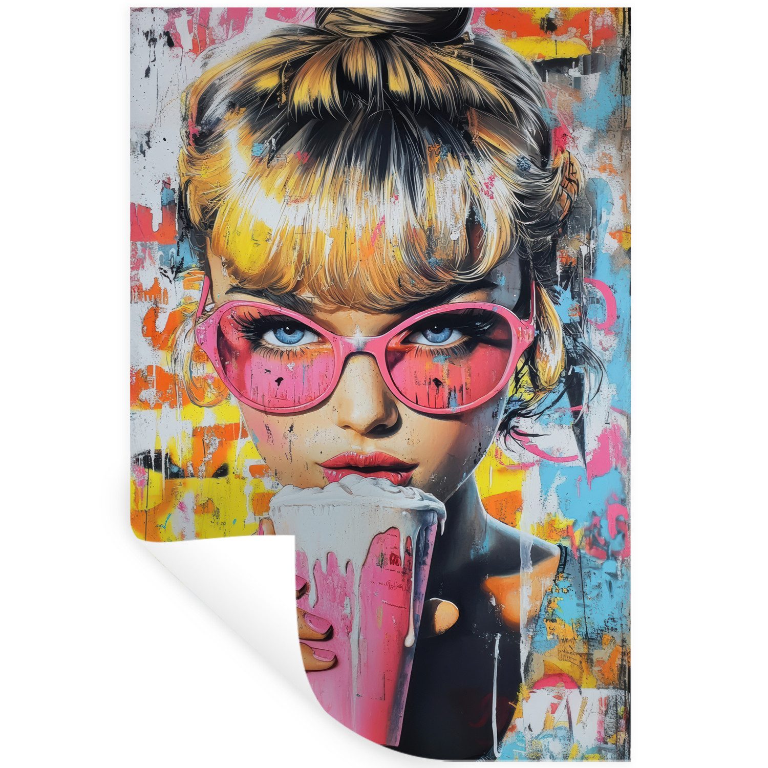 Eine zweite Варианты der Frau mit rosafarbener Brille und Milchshake, mit satteren Farben und zusätzlicher Betonung der Gesichtsdetails und des Hintergrundgraffiti. Eine ausdrucksstarke, moderne Neuinterpretation.