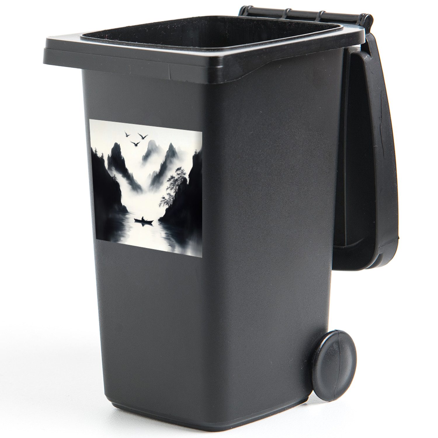 Ein einsamer Ruderer treibt in einem Boot zwischen steilen, nebelverhangenen Bergen, während Vögel über dem Wasser schweben.
