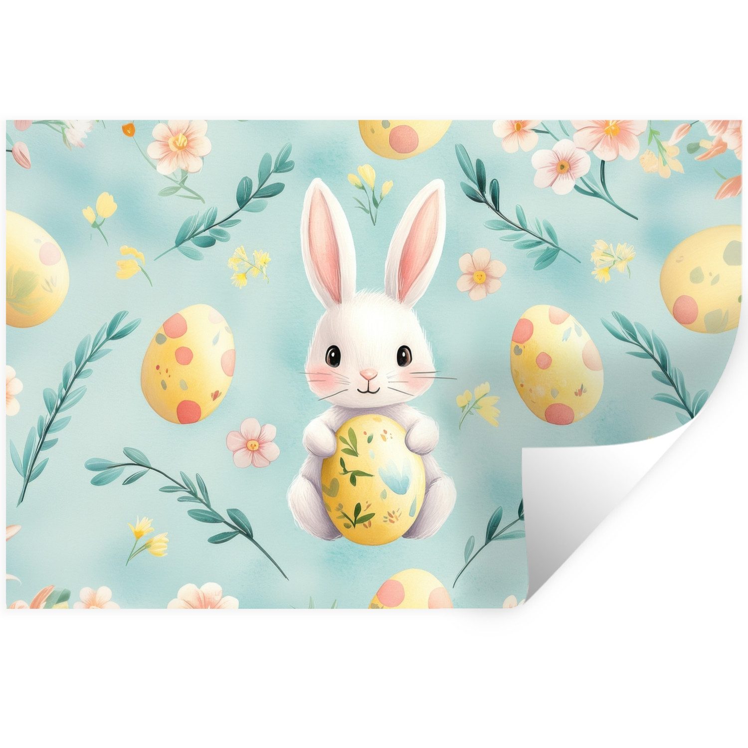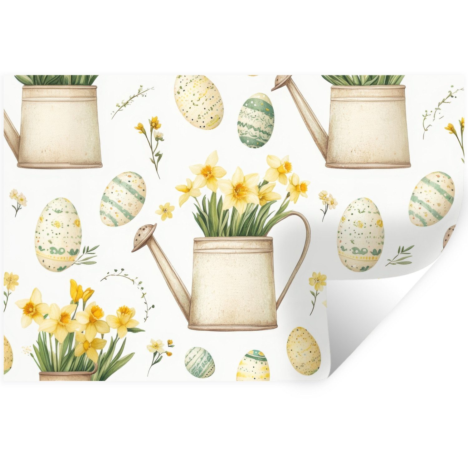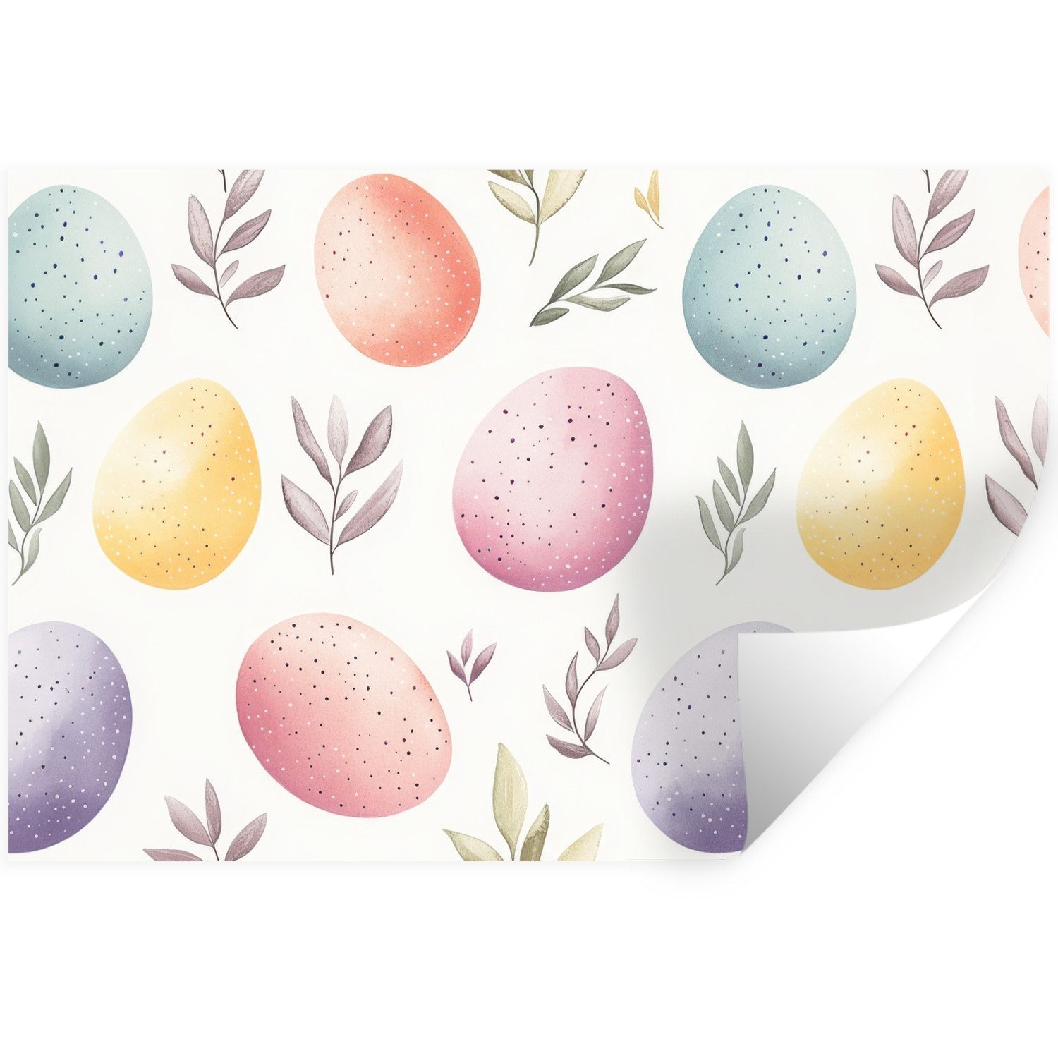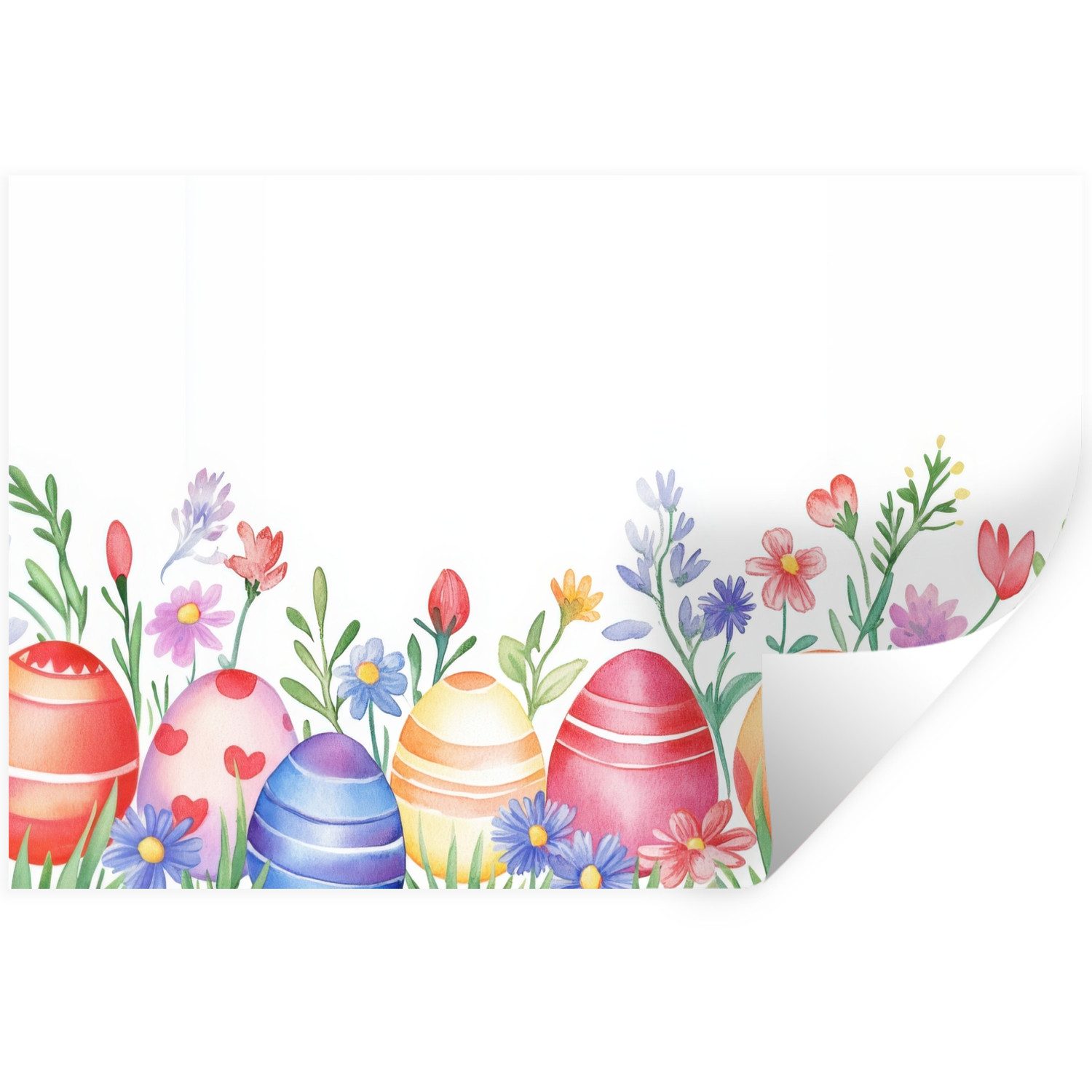 Eine Aquarellillustration mit bunten Ostereiern inmitten von Frühlingsblumen in frischen Farbtönen. Der weiße Hintergrund schafft eine leichte und luftige Komposition.