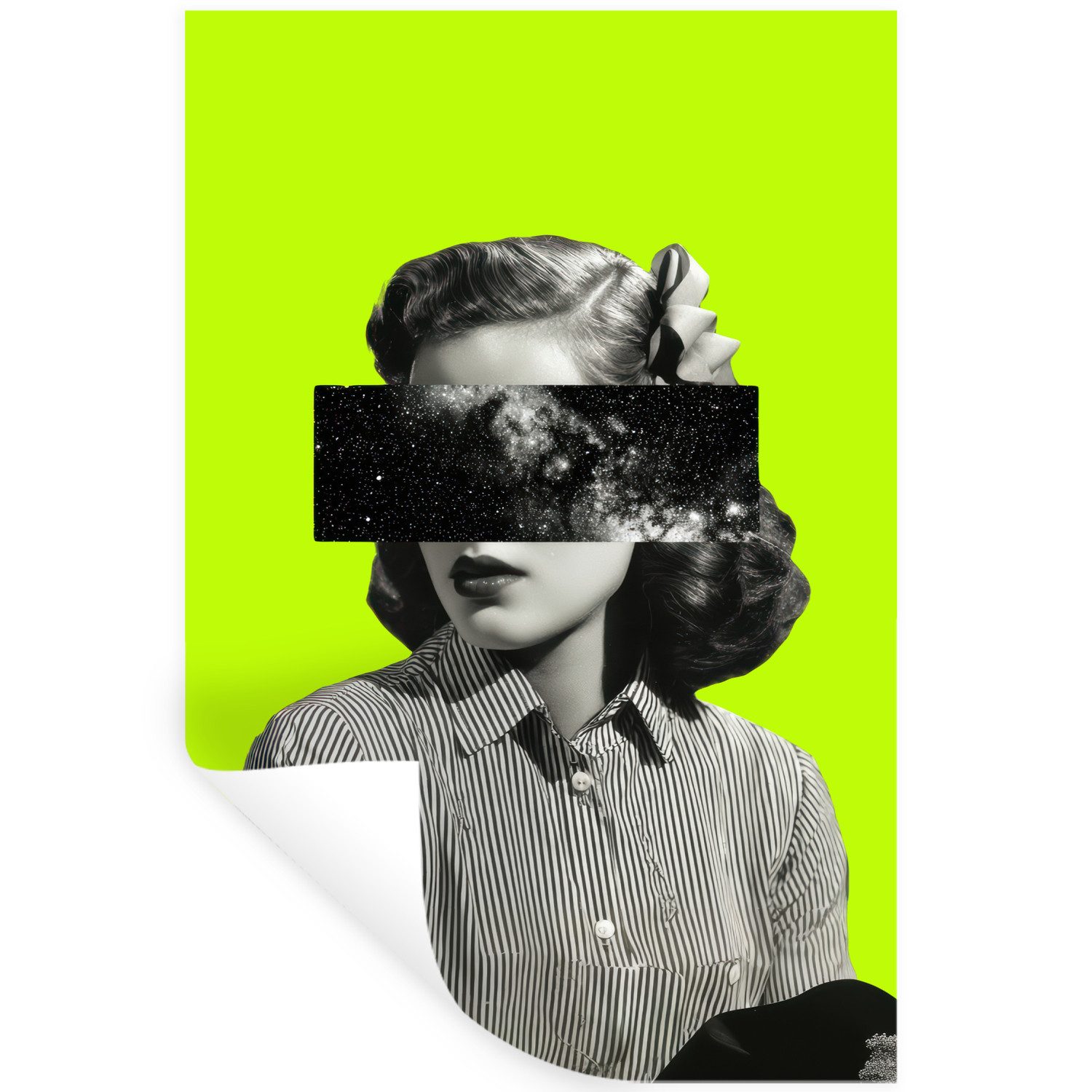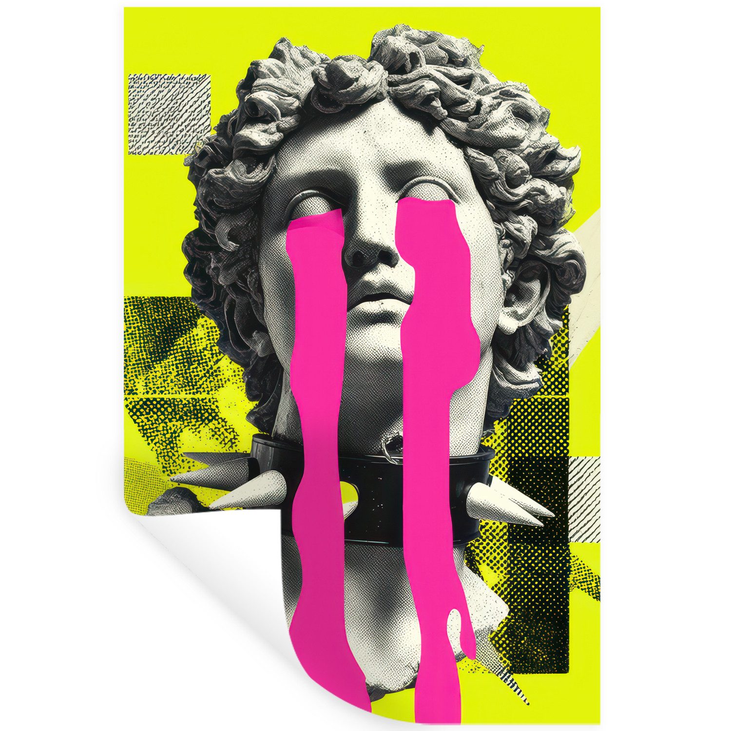 Digitale Collage einer klassischen Marmorbüste, die eine Punk-Kette mit Stacheln trägt. Leuchtend rosa Farbe fließt von den Augen herab. Der Hintergrund ist leuchtend gelb mit grafischen Mustern in Schwarz und Grün, was einen kontrastreichen und rebellischen Effekt erzeugt.